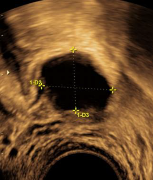 Man begann dann mit einem Zyklusmonitoring. Sonographisch war das Ovarialgewebe in der Peritonealtasche links kaum von einem richtigen Ovar zu unterscheiden (s. Abb. 2).