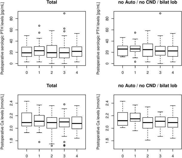 Postoperative parathyroid hormone (PTH) and serum calcium (Ca) levels on the first postoperative day depending on the number of identified parathyroid glands with and without autotransplantation (Auto) and central nodal dissection (CND). bilat lob Bilateral lobectomy