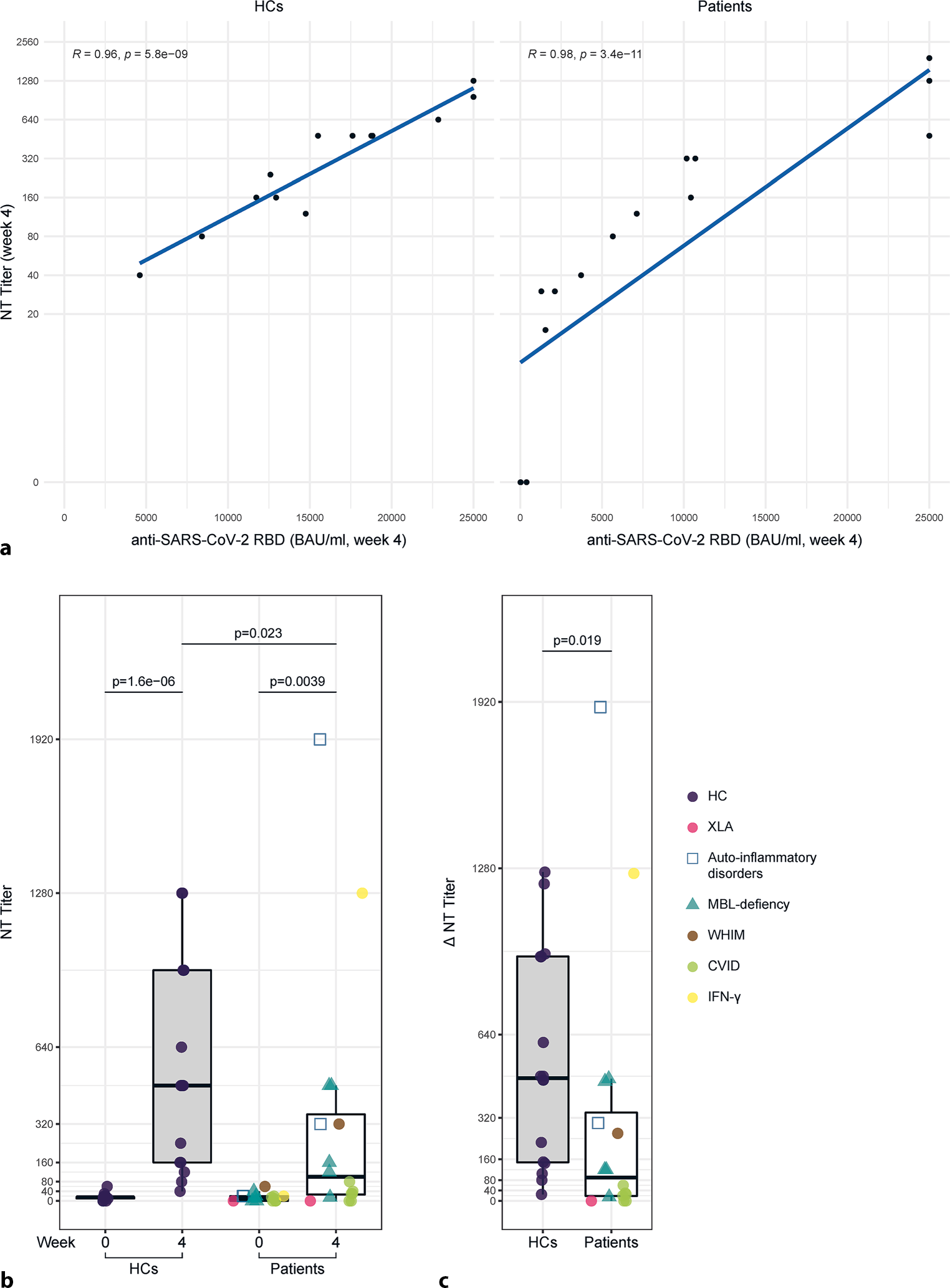 Neutralizing antibody response at week 4 after the 3rd vaccination. a Correlation of antibody levels to the receptor-binding domain (RBD) of the viral spike (S) protein and neutralizing antibodies (NT) against a SARS-CoV‑2 WT virus strain at week 4 after the 3rd vaccination of healthy controls (HCs, n = 16) and IEI/MBLdef patients (n = 16). b Neutralizing antibodies against the SARS-CoV‑2 at week 0 and week 4 after the 3rd vaccination in patients and healthy controls (HCs). c Absolute change (∆) of neutralizing antibodies against SARS-CoV‑2 between week 0 and week 4 after the third vaccination of HCs and patients. XLA X-linked agammaglobulinemia, WHIM warts, hypogammaglobulinemia, immunodeficiency, myelokathexis, MBL mannose-binding lectin, CVID common variable immunodeficiency, IFNγ interferon gamma