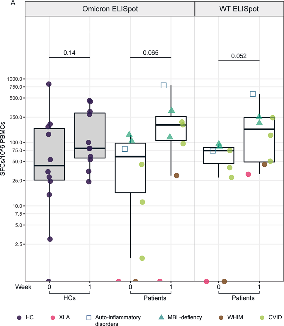SARS-CoV-2-specific T‑cell response. SARS-CoV-2-specific T‑cell responses were determined by IFN‑γ enzyme-linked immunosorbent spot (ELISpot) assay from peripheral blood mononuclear cells (PBMC) stimulated with omicron and with wild type peptide pools (WT) before (week 0) and 1 week after the third vaccination. ELISpot results from 11 HCs and 8 patients before and 1 week after the vaccination stimulated with omicron peptides (left panel). Dots show the sum of total responses from S1 and S2 peptide pools (covering the S1 and S2 domain of the SARS-CoV-2 spike protein). ELISpot results from 8 patients before and 1 week after the vaccination stimulated with WT peptides (right panel). XLA X-linked agammaglobulinemia, WHIM warts, hypogammaglobulinemia, immunodeficiency, myelokathexis, MBL mannose-binding lectin, CVID common variable immunodeficiency, IFNγ interferon gamma