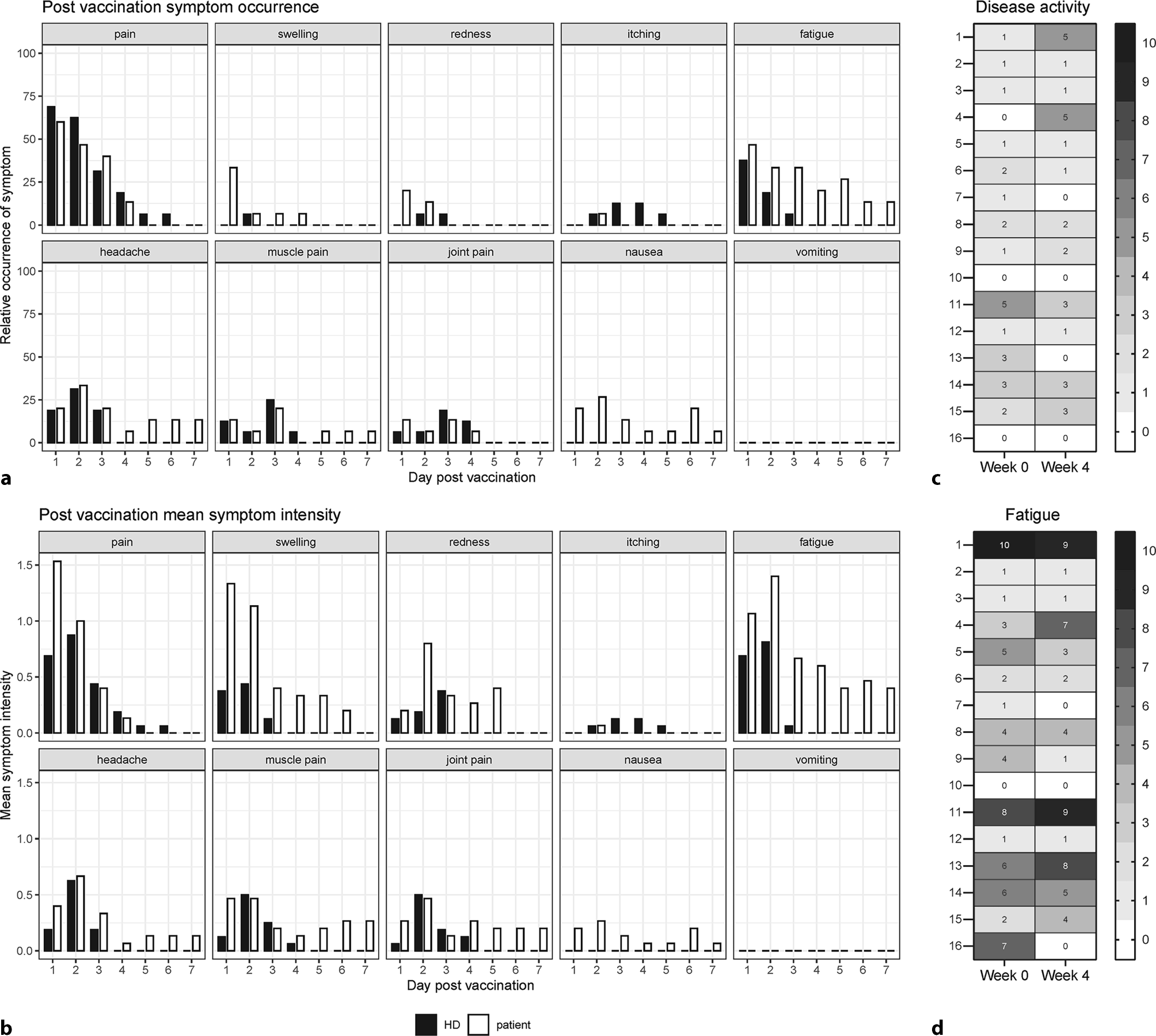 Reactogenicity after the third vaccination. Manifestations at the site of injection and systemic symptoms were recoded over a period of 7 days after vaccination. a Relative occurrence of the indicated symptom in IEI/MBLdef patients (n = 15) and healthy controls (n = 16). (B) Mean symptom intensity. Symptom severity was assessed on a numeric rating scale between 0 and 3. c and d Heatmap of the dynamics of the activity of the underlying disease (c) and fatigue (d) evaluated by using a numeric rating scale ranging from 0 to 10 before the 3rd vaccination and at week 4. Vertical patient numbers refer to Supplementary table 1 with patient number: 1–6 CVID (common variable immunodeficiency), 7 XLA (X-linked agammaglobulinemia), 8 WHIM (warts, hypogammaglobulinemia, immunodeficiency, myelokathexis), 9 IFNGR1 (interferon gamma receptor 1) mutation, 10 MWS (muckle-wells-syndrome), 11 CAPS (cryopyrin-associated periodic syndrome), 12–16 MBLdef (mannose-binding lectin defficiency)