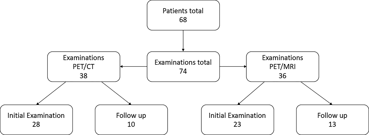 Overall 74 examinations were analyzed in the study with 51 baseline examinations (23 [18F]FDG PET/MRI and 28 [18F]FDG PET/CT) and 23 follow-up examinations under treatment or for disease control (13 [18F]FDG PET/MRI and 10 [18F]FDGPET/CT). Details are shown in Fig. 1.
