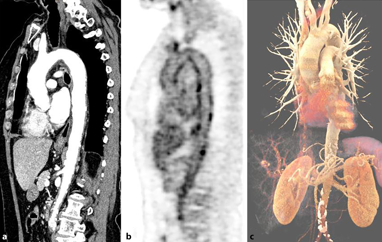 [18F]FDG PET/CT image showing an active aortitis with vessel wall thickening in sagittal reformatted CT angiography images (a) and [18F]FDG uptake at the aortic arch and the descending aorta (b). 3D volume rendering of the aorta shows no pathologic dilatation of the vessel (c). The tracer activity of 263MBq corresponding to 7.1 mSv and a DLP of 1625 mGy*cm corresponded to 24.375 mSv, and made up a total effective dose of 31.5 mSv