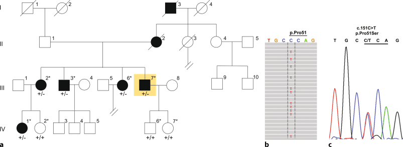 a Autosomal dominant pedigree of the hearing-impaired (black) family under study showing the individual examined by whole-exome sequencing (III/7, shaded yellow). All affected (III/2, III/3, III/6, IV/1) and unaffected (IV/2, IV/6, IV/7) siblings available to the study are marked with an asterisk (*). b Representative graphic of the 35×C and 36×T whole-exome sequencing reads at COCH c.151 in affected proband III/7 visualized with Integrative Genomics Viewer software and c representative chromatogram showing heterozygous (+/−) inheritance of c.151C>T (p.Pro51Ser) in an affected family member by Sanger sequencing (codon 51 is underlined)