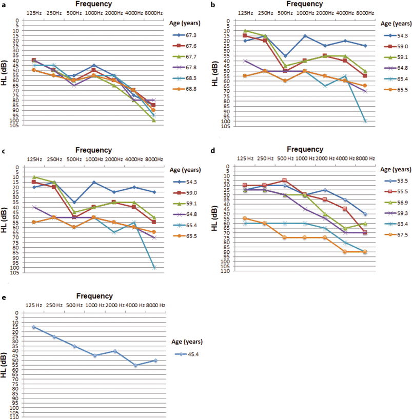 Unaided, masked pure tone audiograms in dB at different ages (years) of affected family members III/2 (a), III/3 (b) III/6 (c), III/7 (d) and IV/1 (e) show very-late-onset progressive hearing loss (single ear shown)
