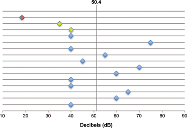 Speech recognition thresholds in a cohort of 15 age-matched patient ears receiving electroacoustic cochlear implants between 2008 and 2016 at the department of Otorhinolaryngology, Head and Neck Surgery, Medical University of Vienna. The index patient in this study (III/7) is shown in yellow (left and right ear). For reference, the speech recognition threshold in an average normal hearing adult is displayed in red. The vertical line displays the mean SRT of 50.4 dB in the cohort under investigation