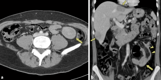 a Die kontrastmittelverstärkte MDCT zeigt eine intraluminale Raumforderung im Dünndarm (Pfeil), welche in der koronalen multiplanaren Rekonstruktion (b) besser zu erkennen ist (Pfeil). Überdies erkennt man hier gut die Invagination des Darms mit Einstülpung von mesenterialem Fettgewebe in das Darmlumen (Pfeilspitzen). Außerdem erkennt man solide intrahepatische Tumoren (kleine Pfeile)