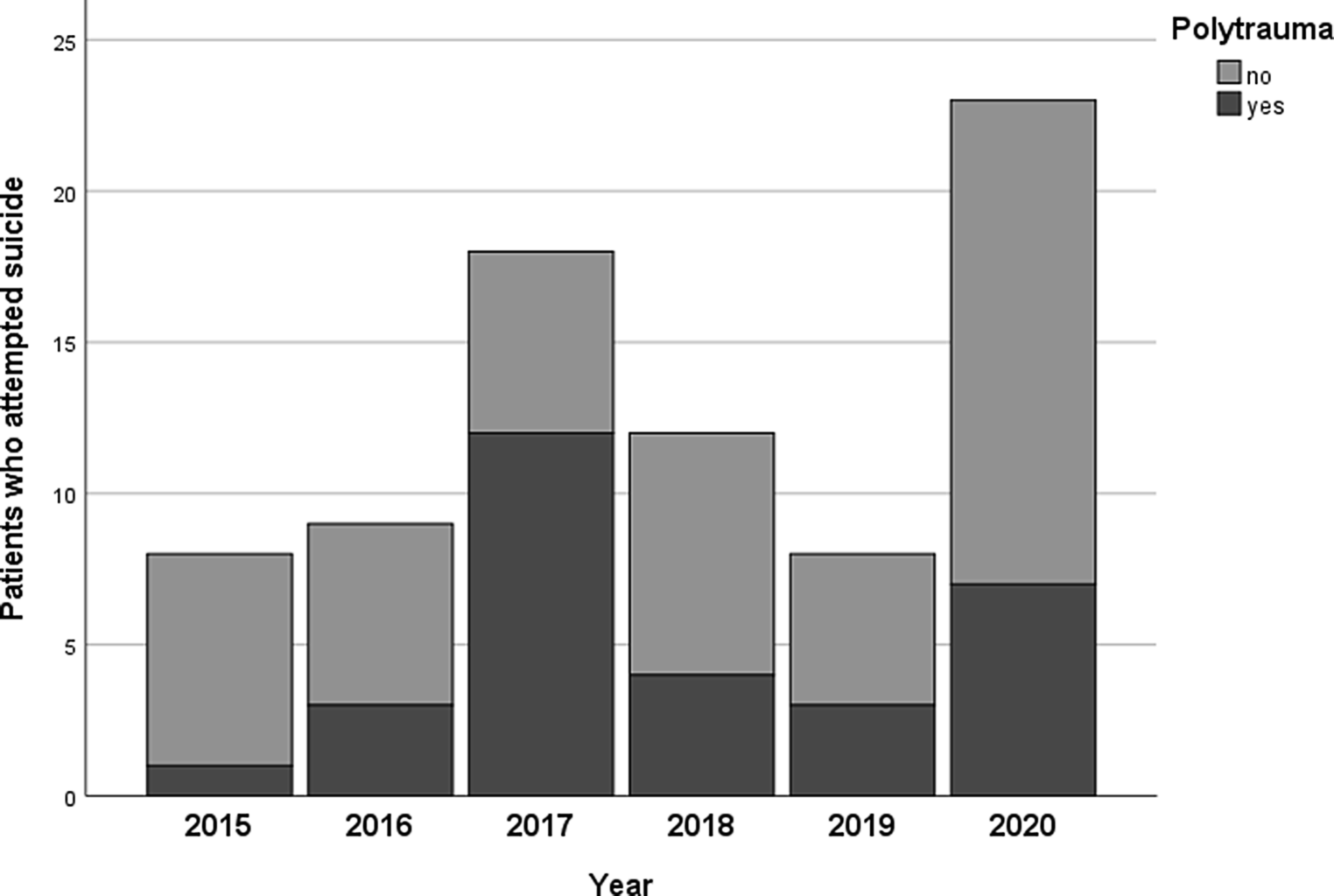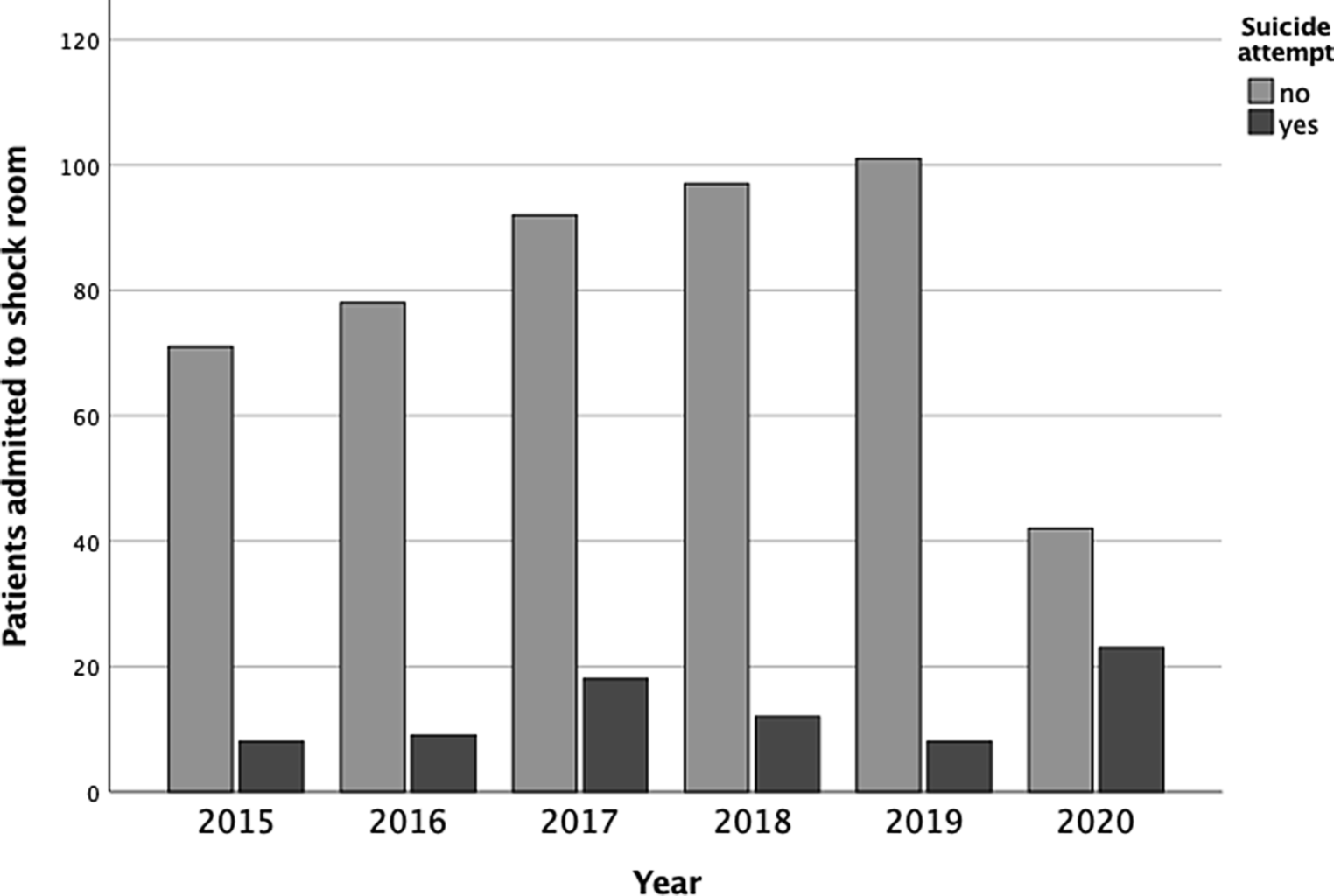 Since we detected a spike of suicide-associated polytrauma patients admitted to our institution for the 2‑month period in 2017 we further investigated the reason for this occurrence, revealing that data were not comparable (as specified in the discussion) and thus had to be excluded from our statistical analysis. In consequence, our control group was formed by all patients admitted to the trauma resuscitation room in 2015, 2016, 2018, and 2019 following a suicide attempt, whereas all suicidal patients treated in 2020 were combined to our study group. As an effect of the lockdown the number of patients admitted due to other causes than suicide decreased markedly in 2020, necessitating a realistic estimate of this number to shed light on the research question regarding a potential increase in suicides as hypothesized. We decided to replace the actual number of patients admitted for other reasons than suicide in 2020 with 87, the average number of patients admitted in 2015, 2016, 2018, and 2019, resulting in a total of 110 fictive admissions to the trauma resuscitation room in 2020, including 20.9% attempted suicides and 6.4% suicidal polytraumas.