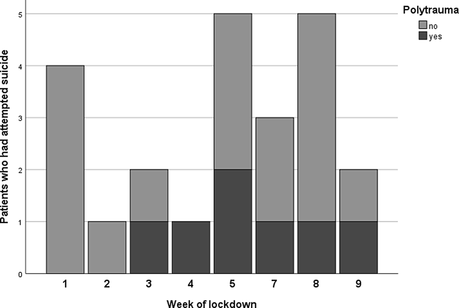 Patients after suicide attempt (polytrauma vs. non-polytrauma) in each week of the lockdown