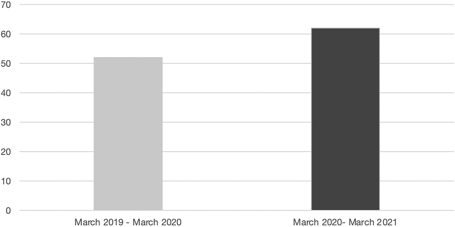 In the period from 12 March 2020 to 11 March 2021, a total of 62 patients were admitted to the Center for Severe Burn Injuries. In comparison, only 52 patients were admitted in the same period of the previous year, which corresponds to an increase of 19.2%. In addition, it was noted that during the 2019–2020 observation period, 27% of patients were female and 73% male, whereas during the pandemic the gender distribution was 42% female and only 58% male. During the pre-pandemic observational period, 13 out of 52 patients admitted died (25%), whereas during the pandemic, 17 out of 62 patients succumbed to their injuries (27%).