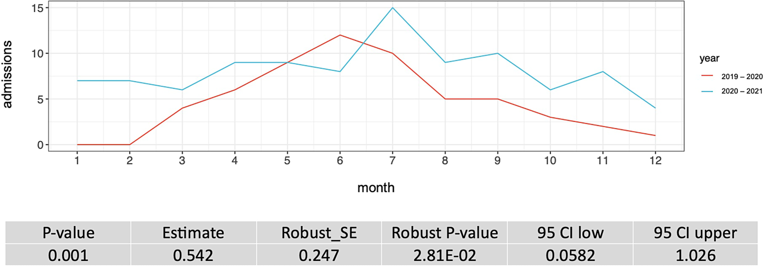 Intensive care unit (ICU) admissions over the course of the months; x‑axis: time in months (1 = January, 2 = February, 3 = ….), y‑axis: ICU admissions; CI confidence interval, SE standard error