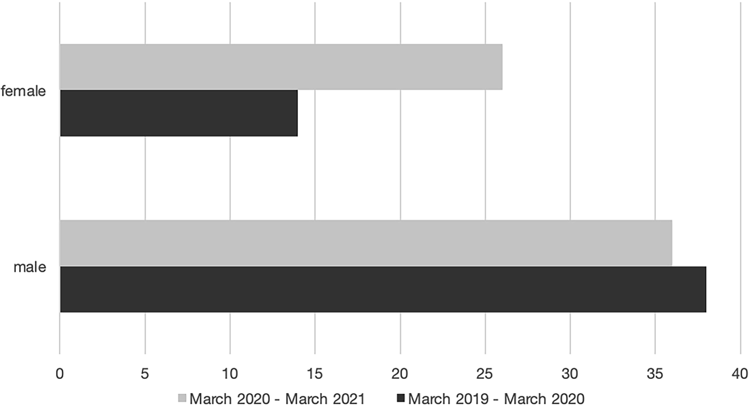 Sex distribution (observation period March 2019—March 2020: n = 52; male = 38, female = 14, observation period March 2020—March 2021: n = 62; male = 36, female = 26); x‑axis: total count of inpatient admissions, y‑axis: sex