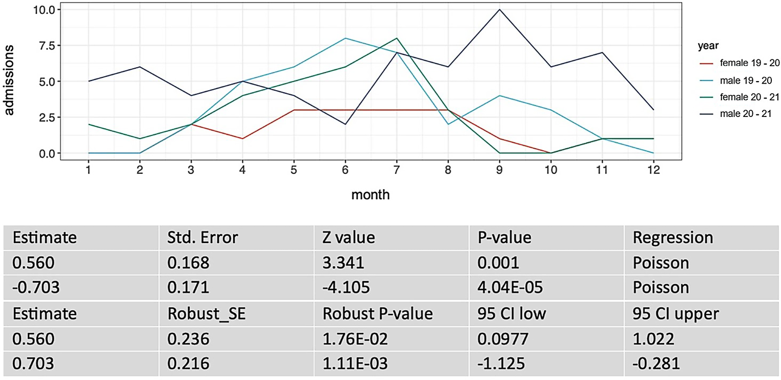 The week of admission and the week of discharge from the ICU for each ICU patient before the COVID-19 pandemic (year 2019–2020) and during the COVID-19 pandemic (year 2020–2021) was recorded. For each week during the two intervals, we counted the number of patients in ICU care. From this, we calculated the number of patients per month and per year. These counts are plotted in Fig. 2 and 4. Next, we performed regression analysis using a generalized linear model, assuming a Poisson distribution of the ICU admissions per week data, to see whether or not the counts are dependent on the year of data recording. We performed a goodness of fit test, as implemented in the R‑package vcd [3] and calculated robust standard errors and P-values to control for mild violation of the distribution assumption. To evaluate the influence of sex on the ICU admissions we ran a generalized mixed model with and without sex as covariate. Subsequently, we performed a χ2-test to compare the two models.