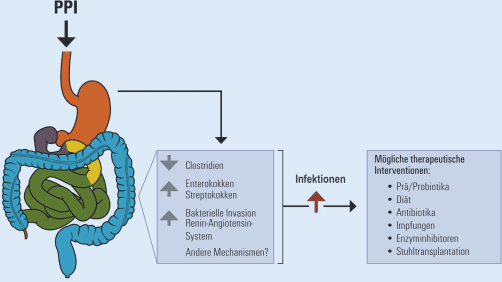 PPI hemmen die H+/K + P-Typ ATPase im Magen und erhöhen damit rasch und effizient den pH-Wert im Magen. Dadurch werden Mikroorganismen aus der Mundhöhle oder durch die Nahrung aufgenommene Mikroorganismen nicht mehr so effektiv abgetötet. Außerdem besitzen manche Bakterien ebenfalls diese ATPase und dadurch können PPI die Zusammensetzung des Mikrobioms beeinflussen. Daten von Freiwilligen, die PPI einnahmen und von Patienten unter Langzeit-PPI-Therapie zeigen, dass sich das Mikrobiom in seiner Zusammensetzung ändert. Die Gesamtkeimzahl im Darm scheint anzusteigen, während die Diversität abnimmt. In der taxonomischen Zusammensetzung kommt es zu einer Vermehrung von potenziell pathogenen Keimen sowie zu einer „Oralisierung“, d. h. man findet typische Mundkeime vermehrt im Darm. Die direkten Folgen dieser Mikrobiomveränderungen sind noch nicht vollkommen entschlüsselt. Zahlreiche Studien zeigen einen Zusammenhang von PPI-Einnahme mit Infektionen. Am besten belegt ist der Zusammenhang mit Clostridium-difficile-Infektionen. Besonders bei kritisch kranken Patienten konnten PPI als unabhängiger Risikofaktor für Clostridium-difficile-Infektionen identifiziert werden (Odds Ratio 3,1). Das Risiko scheint dosisabhängig zu steigen. Als Ursache dafür wird eine verminderte Diversität des Darmmikrobioms, insbesondere der Familie der Clostridiaceae, sowie die veränderte Funktion des Mikrobioms mit einem Anstieg an bakteriellen Invasionsgenen durch PPI vermutet (Abb. 2). Allerdings konnten nicht alle Studien und Metaanalysen das erhöhte Risiko bestätigen, insbesondere weil es bei kritisch Kranken durch andere Medikamente, allen voran Antibiotika, viele Faktoren gibt, die das Risiko für eine Clostridium-difficile-Infektion erhöhen. Auch andere Darminfektionen sind unter PPI-Einnahme häufiger. Besonders das Risiko für die Entwicklung einer Reisediarrhoe scheint mit einer Odds Ratio von 6,9 deutlich erhöht zu sein. Diesbezüglich gibt es aber bisher deutlich weniger Studien als zur Clostridium-difficile-Infektion.