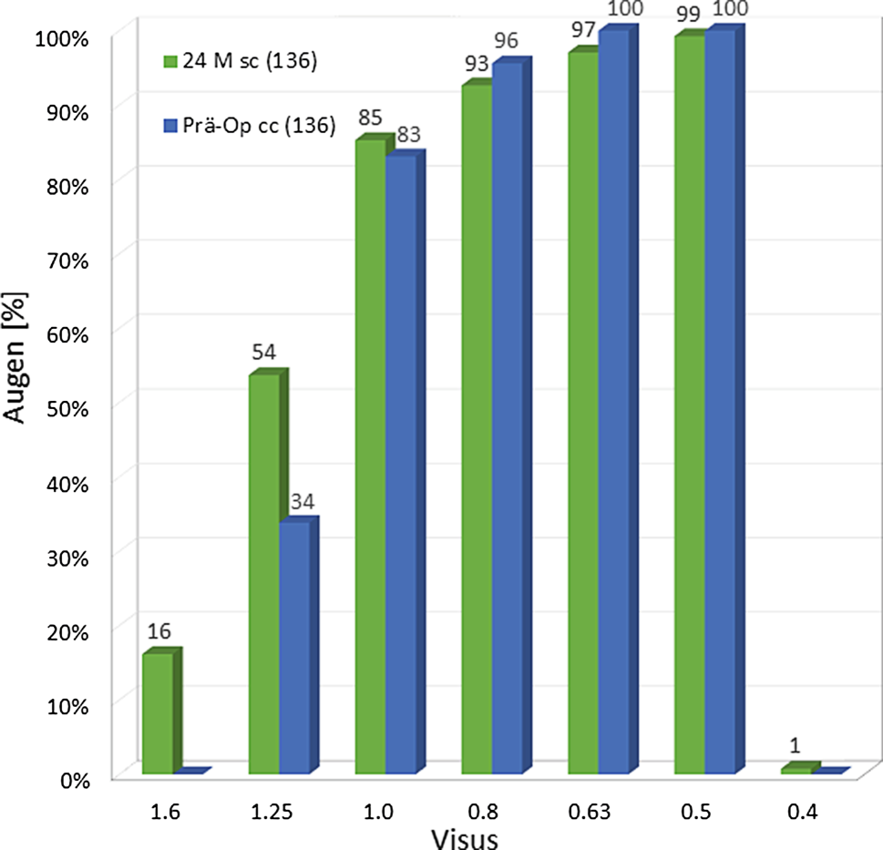 Es liegen jetzt auch eigene Ergebnisse der Implantation der torischen Artiflex® bei myopem Astigmatismus mit einer Nachkontrollzeit von 2 Jahren vor. Bei 136 Augen von 79 Patienten (49 weiblich, 30 männlich) im mittleren Alter von 38 ± 9,5 Jahren (20 bis 61 Jahre) wurde eine torische Artiflex® implantiert. Das präoperative sphärische Äquivalent lag bei −8,85 dpt ± 2,28 dpt (−2,63 bis −13,75 dpt), der mittlere refraktive Astigmatismus bei 1,95 dpt ± 0,82 dpt (1 bis 5 dpt). Zwei Jahre postoperativ erreichen 85 % der Augen einen unkorrigierten Fernvisus von 1,0 oder besser, 54 % von 1,25 oder besser und 16 % von 1,6 oder besser (Abb. 2). Das sphärische Äquivalent der manifesten Refraktion lag zu diesem Zeitpunkt im Mittel bei −0,08 dpt (−1,25 bis +0,63 dpt), 100 % lagen innerhalb von ±1 dpt, 96 % innerhalb von ±0,5 dpt (Abb. 3). Der refraktive Astigmatismus war 24 Monate postoperativ im Mittel bei 0,19 dpt ± 0,32 dpt (0 bis 1,5 dpt). Der Endothelzellverlust betrug 0,89 %.