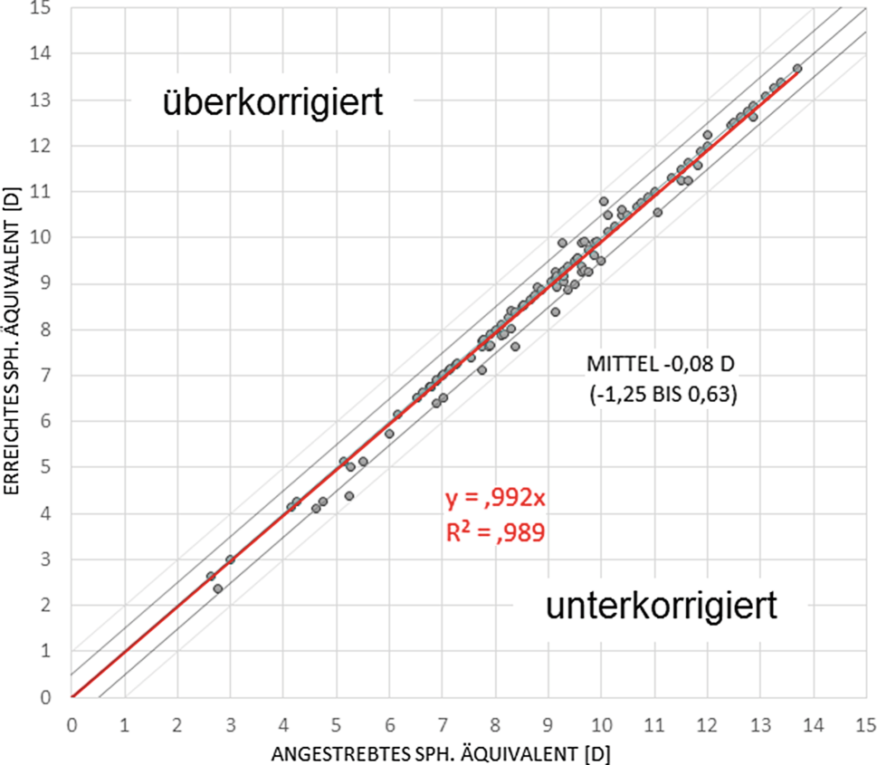 Die Implantation von irisfixierten pIOLs hat sich auch durch die genaue Vorhersagbarkeit bewährt. In eigenen Daten beträgt das sphärische Äquivalent der manifesten Refraktion im Mittel −0,08 dpt (−1,25 bis +0,63 dpt), 100 % liegen innerhalb von ±1 dpt, 96 % innerhalb von ±0,5 dpt nach 2 Jahren (torische Artiflex®). Dies ist vergleichbar mit einer anderen Studie von Dick et al., in der 75,3 % der Augen nach 6 Monaten, 75,5 % nach 1 Jahr und 75,2 % nach 2 Jahren innerhalb von ±0,5 dpt liegen [7].