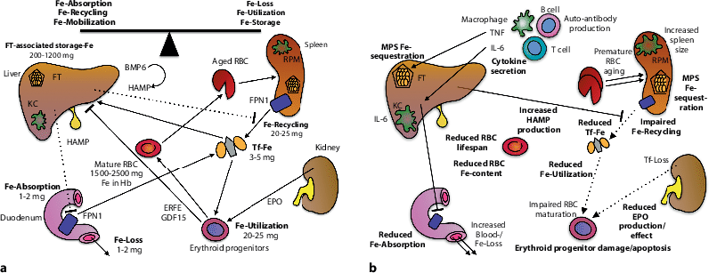 In addition, combined forms of IDA and AI may be present. This scenario is typically observed in inflammatory bowel disease (IBD) or gastrointestinal or urogenital malignancy. Mucosal erosions and ulcerations are associated with recurrent bleeding episodes and lead to a substantial loss of iron, since 0.5 mg of iron are contained within the Hb of 1 ml of blood. At the same time, the underlying disease provides an inflammatory stimulus for the sequestration of iron in the MPS. Moreover, menstruation, hemodialysis, the requirement for repetitive blood sampling, and anticoagulant or antiplatelet drugs may contribute to iron loss in CKD and other chronic diseases.