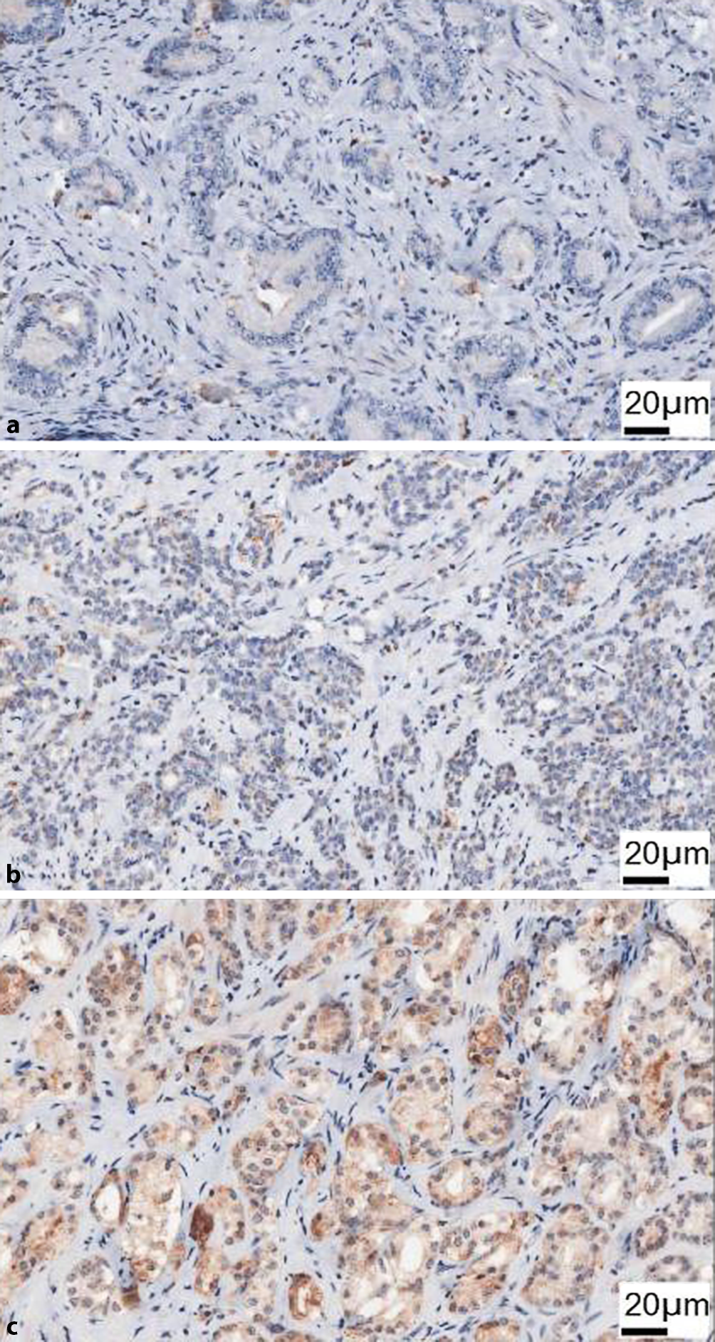 GP88, immunhistochemischer Nachweis: a IRS = 0; b IRS = 2 (Intensität schwach: 1, prozentualer Anteil 30 %: 2); c IRS = 8 (Intensität moderat: 2, prozentualer Anteil: 100 %). (Mod. nach [22])