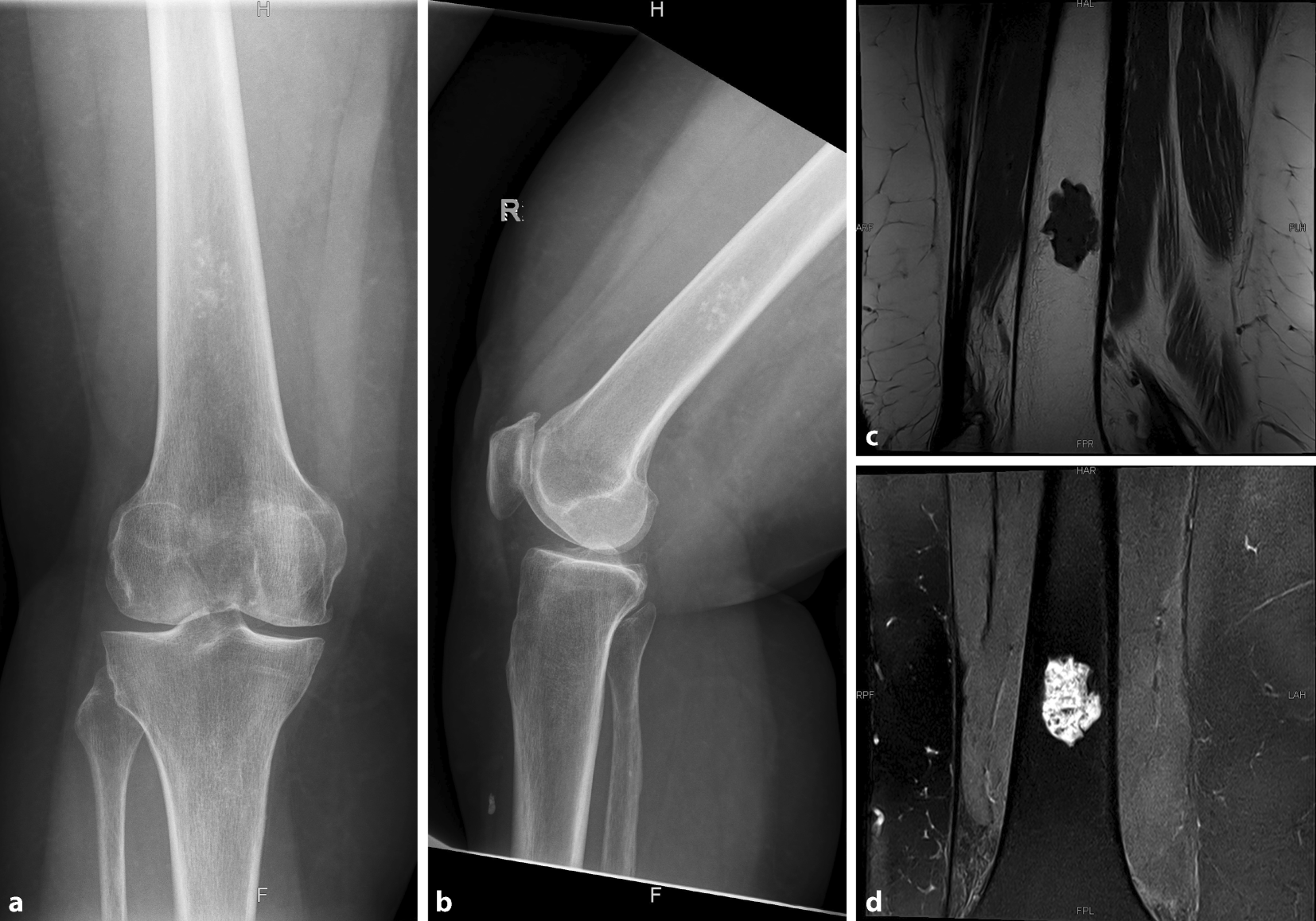 Röntgenbild des rechten Kniegelenks a. p. (a) und seitlich (b) einer 69-jährigen Patientin, das einen zentral liegenden, popcornartig verkalkten chondrogenen Tumor zeigt. In Zusammenschau mit der MRT (c sagittal, T1 TSE; d koronar, Proton Density [PD] Turbo Spin Echo [TSE] Fett Sat [FS]), die eine zentral im Markraum lokalisierte, gut demarkierte Läsion ohne Scalloping oder umgebendes Knochenmarksödem zeigt, handelt es sich um ein Enchondrom