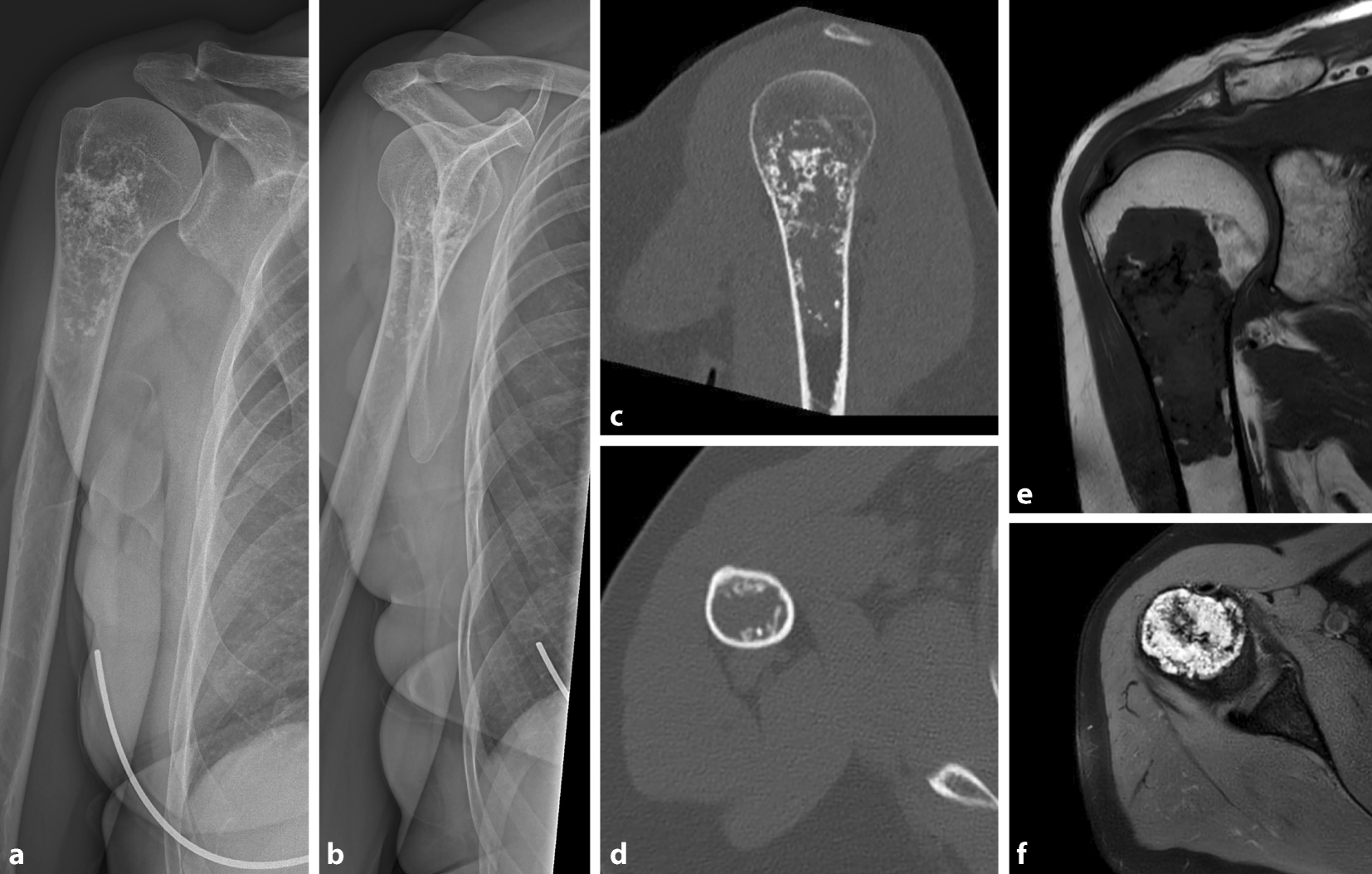 Da nativradiologisch der Verdacht auf einen chondrogenen Tumor bestand, wurde die weitere Bildgebung durch Computertomographie (CT) und MRT ergänzt. Im CT war eine 7 cm (c.c.) × 3,6 cm (m.l.) × 3,1 cm (a. p.) messende, verkalkte Läsion nachweisbar, die ein kurzstreckiges, tiefes endostales Scalloping aufwies ohne Periostreaktion oder Kortexdurchbruch (Abb. 2c, d). In der korrespondierenden MRT präsentierte sich die Läsion als hypointens in T1 (Abb. 2e) sowie hyperintens in der PD-gewichteten Sequenz (Abb. 2f). Es bestand keine perifokale Ödembildung, keine Periostreaktion, die Weichteile waren reizfrei. Nebenbefundlich zeigte sich die aktivierte Akromioklavikulargelenksarthrose (Abb. 2e, f).