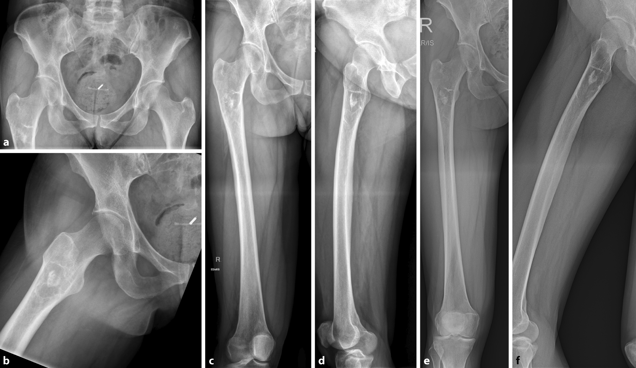 Bei einer 50-jährigen Patientin wurden bei länger andauernden ziehenden Schmerzen in der unteren Lendenwirbelsäule, ausstrahlend in den rechten proximalen Oberschenkel, Röntgenbilder des Beckens und der rechten Hüfte angefertigt (Abb. 3a, b). An der mitabgebildeten unteren Lendenwirbelsäule zeigten sich inzipiente degenerative Veränderungen. Auffallend war am proximalen Femur rechts eine zentral verkalkte, gut randsklerosierte, „milchglasartig“ imponierende Läsion ohne Periostreaktion oder Kortikalisdestruktion.
