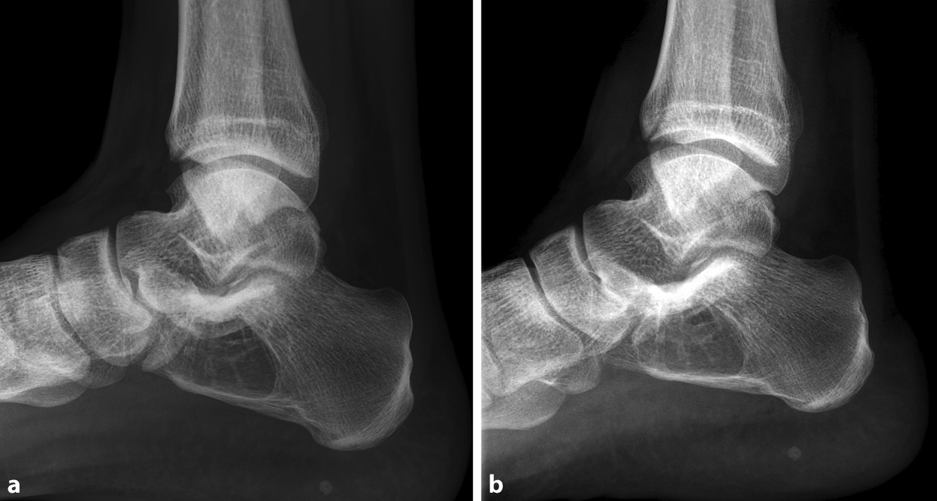 Die typische Lage und das radiologische Erscheinungsbild führte zur Verdachtsdiagnose eines intraossären Kalkaneuslipoms (siehe unten; Abb. 4a). Die Beschwerden wurden auf die Fußfehlstellung selbst zurückgeführt. Daher wurde keine bildgebende Verlaufskontrolle oder weitere Therapie für das Kalkaneuslipom empfohlen. Aufgrund der Beschwerden am Fuß selbst wurde nach 7 Monaten erneut eine Röntgendiagnostik durchgeführt, in der sich das Kalkaneuslipom völlig unverändert zeigte (Abb. 4b).