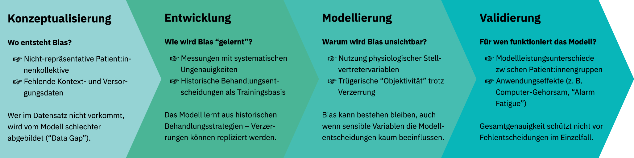 Die Qualität der zugrundeliegenden Daten ist dabei entscheidend. Enthalten Trainingsdatensätze systematische Verzerrungen (Bias), können diese von KI-Modellen übernommen und bestehende Versorgungsungleichheiten reproduziert werden [2‐4]. Um das Potenzial der KI für alle Patient:innen auszuschöpfen, müssen wir verstehen, wo entlang der Modellentwicklung Bias entstehen kann, nicht als Argument gegen den Einsatz von KI, sondern als Voraussetzung für Fairness und Qualität in der klinischen Anwendung.
