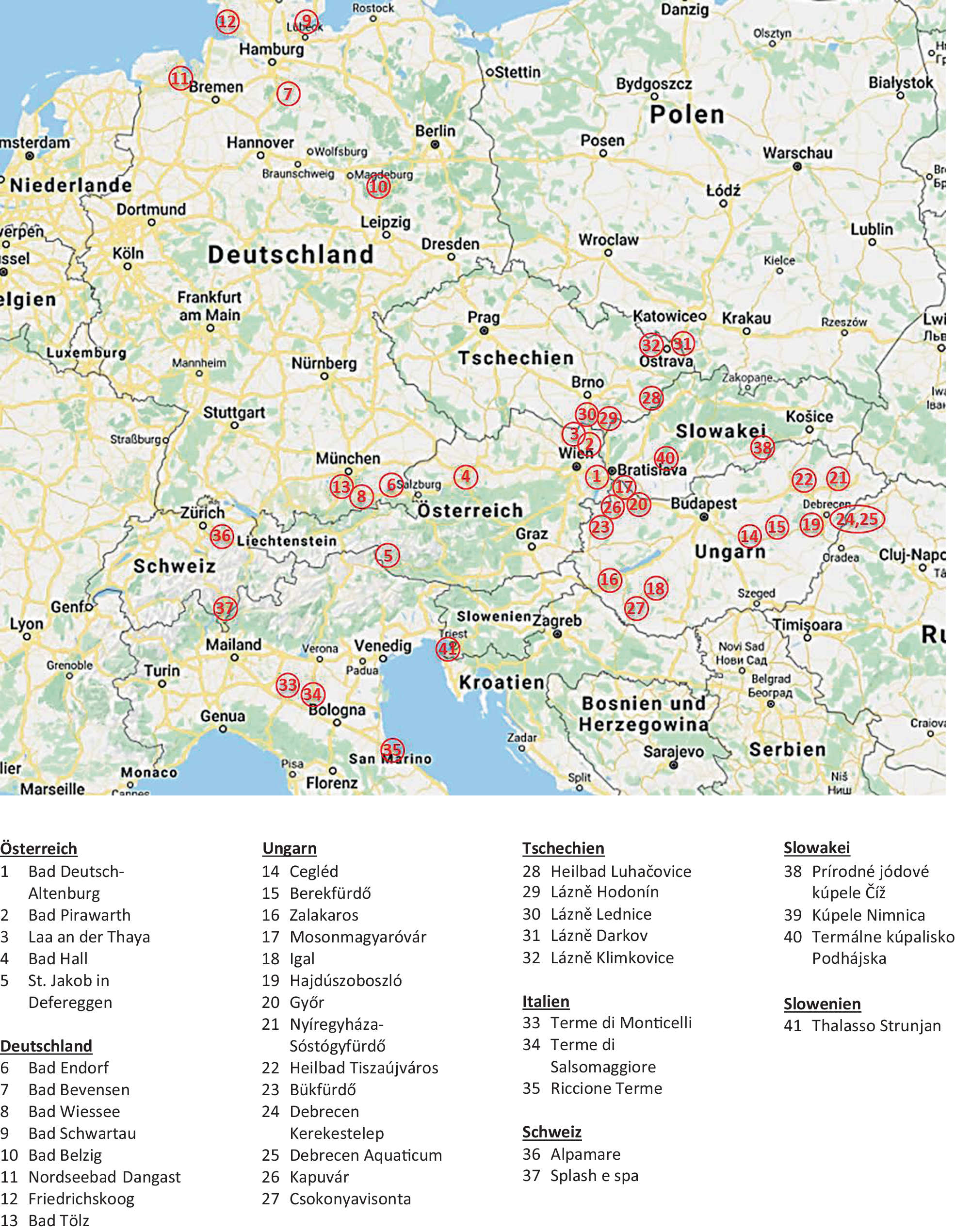 Die Abb. 1 gibt eine geografische Übersicht von den verfügbaren natürlichen Heilvorkommen mit einem Jodgehalt von ≥1 mg Jod/l bzw. kg. Geografische Schwerpunkte mit jodhaltigen Heilvorkommen stehen in engem Zusammenhang mit den geologischen Gegebenheiten der einzelnen Regionen. Die Karte zeigt Schwerpunkte von Thermalorten mit jodhaltigem Wasser in Südbayern, im Dreiländereck Österreich-Tschechien-Slowakei und Österreich-Slowakei-Ungarn, in Süd- und Ostungarn sowie in Italien in der Poebene (Abb. 1). In Tab. 1 sind diese natürlichen Heilvorkommen nach Ländern gegliedert angeführt und die an den Standorten verwendeten Kuranwendungen aufgelistet. Nicht angeführt sind in dieser Tabelle Heilvorkommen mit einem geringeren Jodgehalt als 1 mg/l bzw. kg, Heilvorkommen, die aktuell nicht oder nur für andere Zwecke genutzt werden (z. B. Herstellung von Mineralwasser/Heilwasser) bzw. nicht für Kuranwendungen zur Verfügung stehen. Eine Gesamtübersicht aller natürlichen jodhaltigen Heilquellen von Österreich und den angrenzenden Nachbarstaaten steht als Addendum (Attachment 1) in der Online-Version des Artikels (https://doi.org/10.1067/s10354-020-00782-x) zur Verfügung.