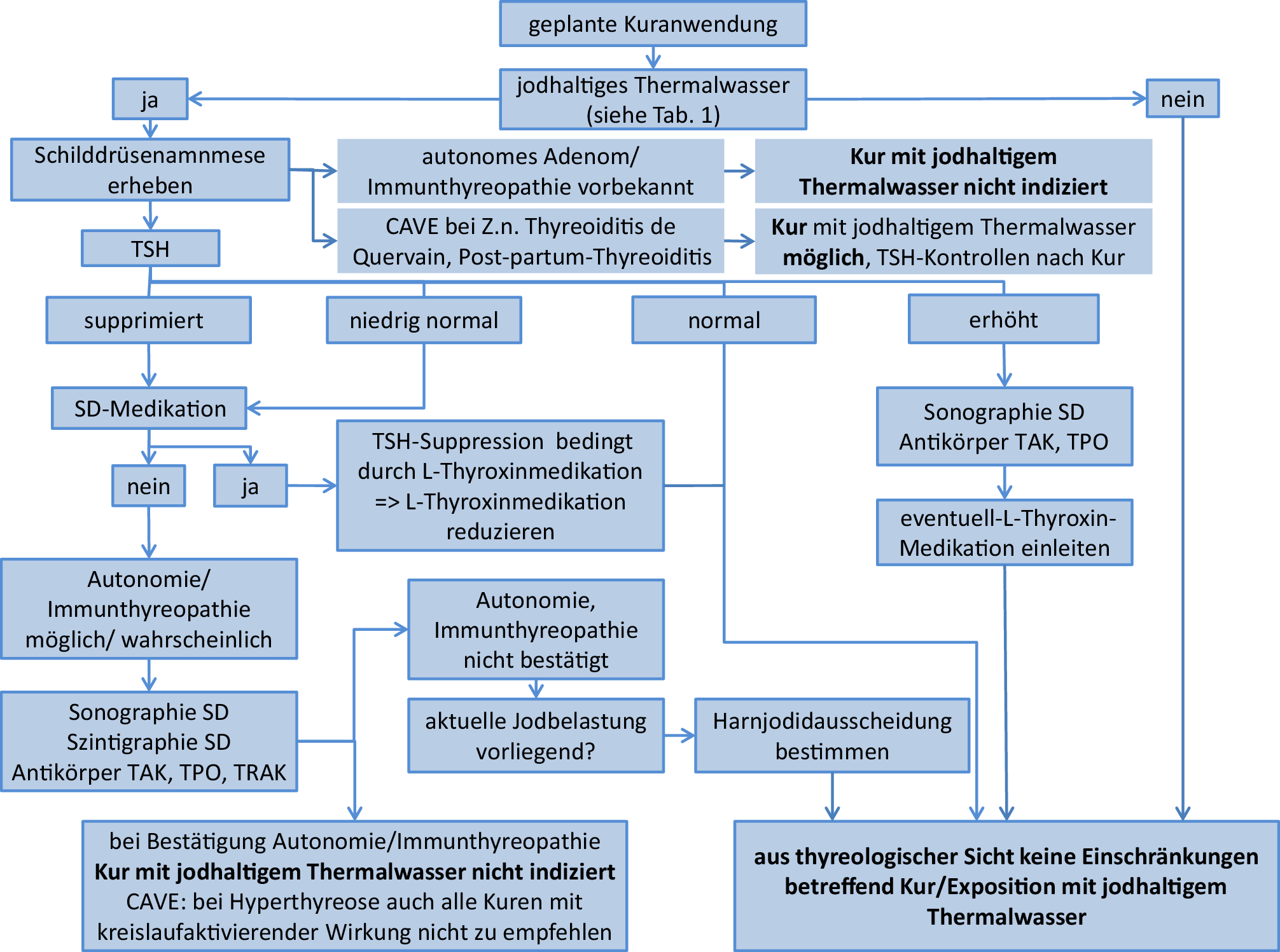 Aus thyreologischer Sicht ergeben sich für die Klinik mehrere Fragen: Können Patienten, die keine Schilddrüsenvorerkrankung haben, aus thyreologischer Sicht ohne Bedenken eine Kuranwendung mit jodhaltigem Thermalwasser durchführen? Welchen Patienten mit einer Schilddrüsenvorerkrankung können keine jodhaltigen Kuranwendungen empfohlen werden, und bei welchen Konstellationen ist ein Kurantritt unter dem Gesichtspunkt einer Risiko-Nutzen-Abwägung möglich? An welchen Kurorten gibt es jodhaltige Kuranwendungen? Nach welchem Algorithmus könnte eine Selektion von Patienten vor Kurantritt vorgenommen werden, um das Risiko möglicher negativer Auswirkungen einer erhöhten Jodzufuhr zu minimieren?