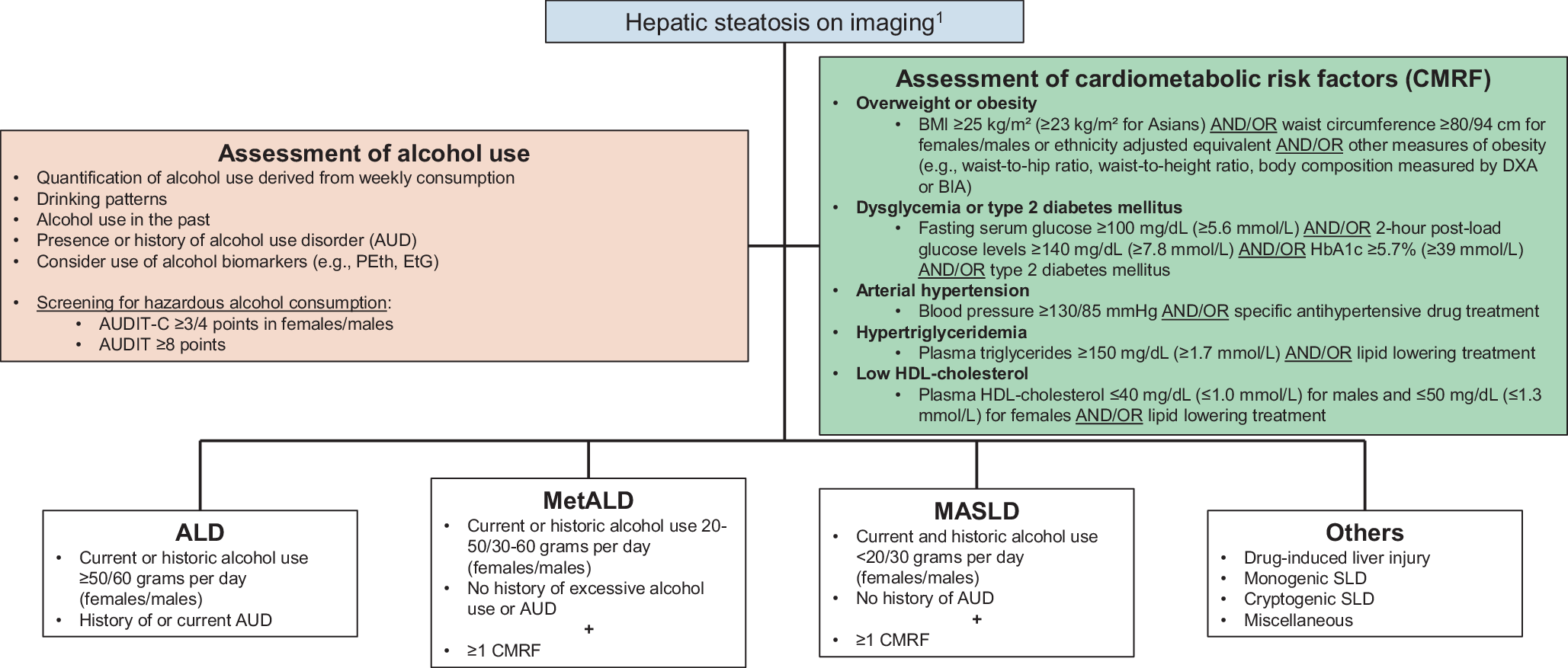 Diagnosis and work-up of steatotic liver disease (SLD) and its sub-entities. ALD alcohol-related liver disease, AUD alcohol use disorder, BIA bioimpedance analysis, BMI body mass index, CMRF cardiometabolic risk factors, DXA dual-energy X‑ray absorptiometry, ETG ethyl glucuronide, MASLD metabolic dysfunction-associated steatotic liver disease, MetALD metabolic dysfunction and alcohol-related steatotic liver disease, PEth phosphatidylethanol, SLD steatotic liver disease