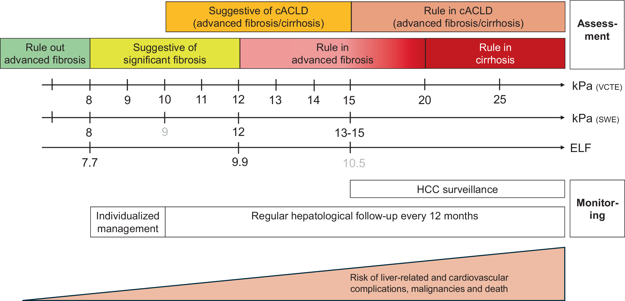 Interpretation of VCTE, SWE, and ELF and resulting monitoring recommendations. Numbers in grey indicate cut-offs supported by less evidence. cACLD compensated advanced chronic liver disease, ELF Enhanced Liver Fibrosis test, HCC hepatocellular carcinoma, LSM liver stiffness measurement, SWE shear-wave elastography, VCTE vibration-controlled transient elastography