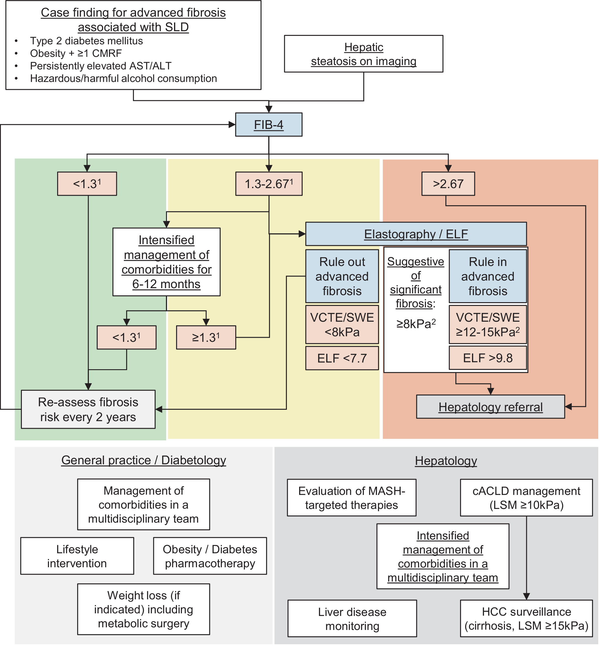 Algorithm for risk assessment in individuals with MASLD/MetALD, applicable for case finding of fibrosis associated with SLD. 1 Age-adjusted cut-off < 2 to rule out advanced fibrosis if age > 65 years. 2 If a false positive result is suspected, repeat after 2–4 weeks. ALD alcohol-related liver disease, ALT alanine aminotransferase, AST aspartate aminotransferase, cACLD compensated advanced chronic liver disease, CMRF cardiometabolic risk factors, ELF Enhanced Liver Fibrosis test, HCC hepatocellular carcinoma, LSM liver stiffness measurement, MASH metabolic dysfunction-associated steatohepatitis, MASLD metabolic dysfunction-associated steatotic liver disease, MetALD steatotic liver disease with metabolic-dysfunction and alcohol-related components, SLD steatotic liver disease, SWE shear-wave elastography, VCTE vibration-controlled transient elastography