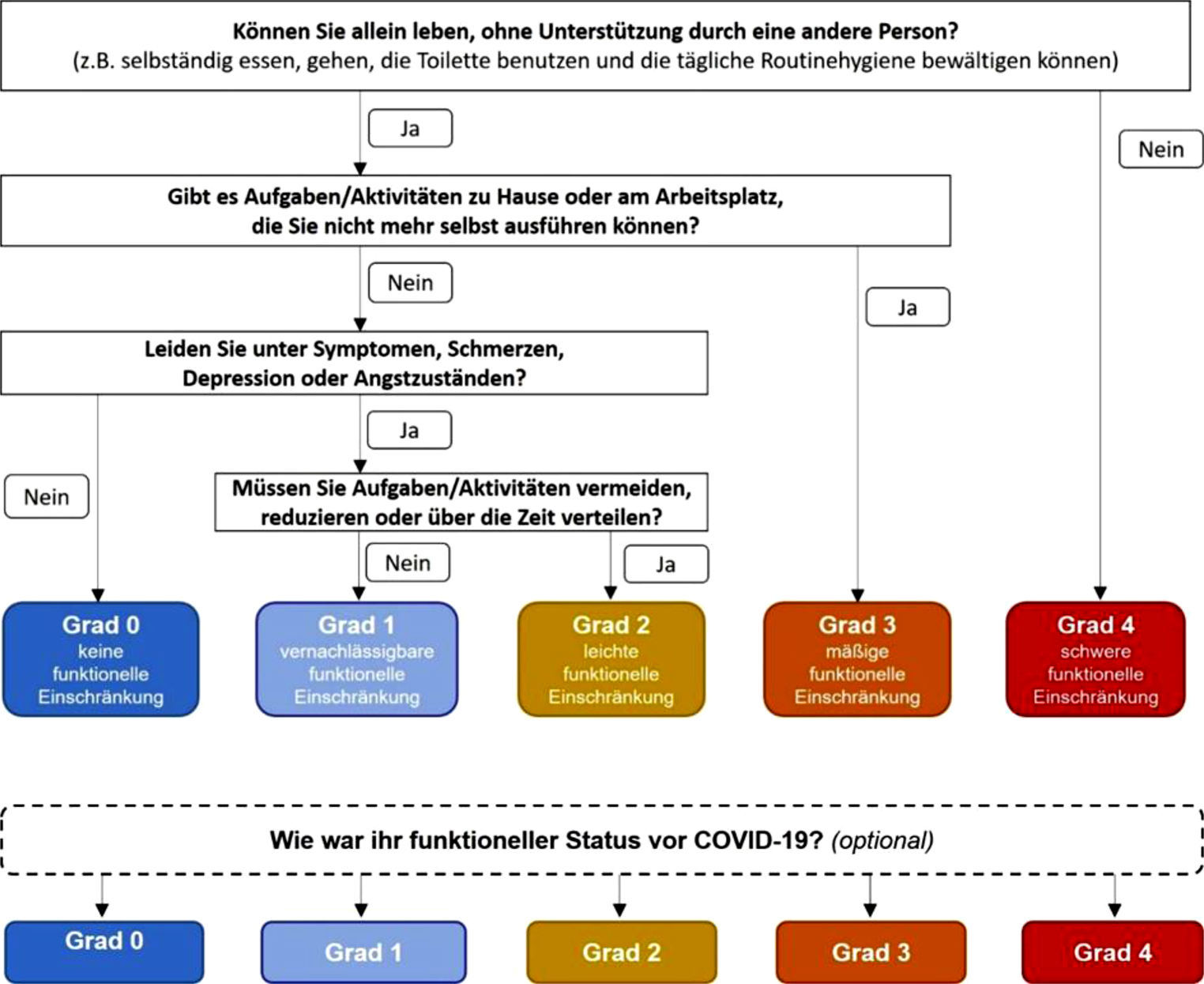Eine Vereinheitlichung der Terminologie bzw. eine Klassifizierung ist bisher noch nicht erreicht. In vielen Publikationen werden unterschiedliche Folgen von COVID‑19 unter dem Begriff „Long COVID“ gefasst [4]: Dazu zählen Folgen schwerer Akuterkrankung und deren Komplikationen, Verschlechterung vorbestehender Grundkrankheiten, fortbestehende Symptome der Erkrankung selbst, bzw. nicht zuordenbare Folgebeschwerden aus nicht vollständig geklärten Pathomechanismen, neu aufgetretene Erkrankungen [5‐7]. Andere schränken den Begriff stärker auf diejenigen Symptome ein, die klinisch dem Krankheitsbild bei COVID‑19 zuordenbar [8] und nicht organisch-strukturelle Folge schwerer Erkrankung [9] sind.