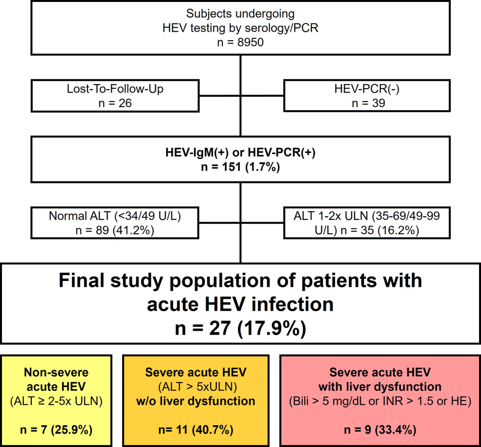 Non-severe acute HEV infection: patients who were HEV-IgM or PCR (+) and had ALT elevation 2–5 times ULN.