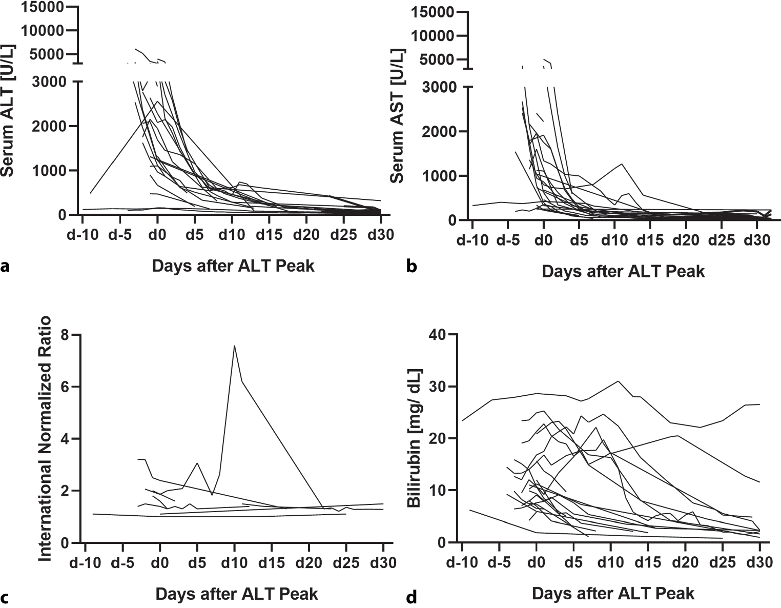 Biochemical alterations associated with acute HEV reportedly persist for 4–6 weeks, while symptoms resolve after 1–2 weeks [26]. In contrast in our cohort transaminases normalized within 10 days after the peak of ALT peak (Fig. 2a,b). Bilirubin also normalized faster than previously reported in most patients, although, in some patients, bilirubin normalization took up to 1 month (Fig. 2d).