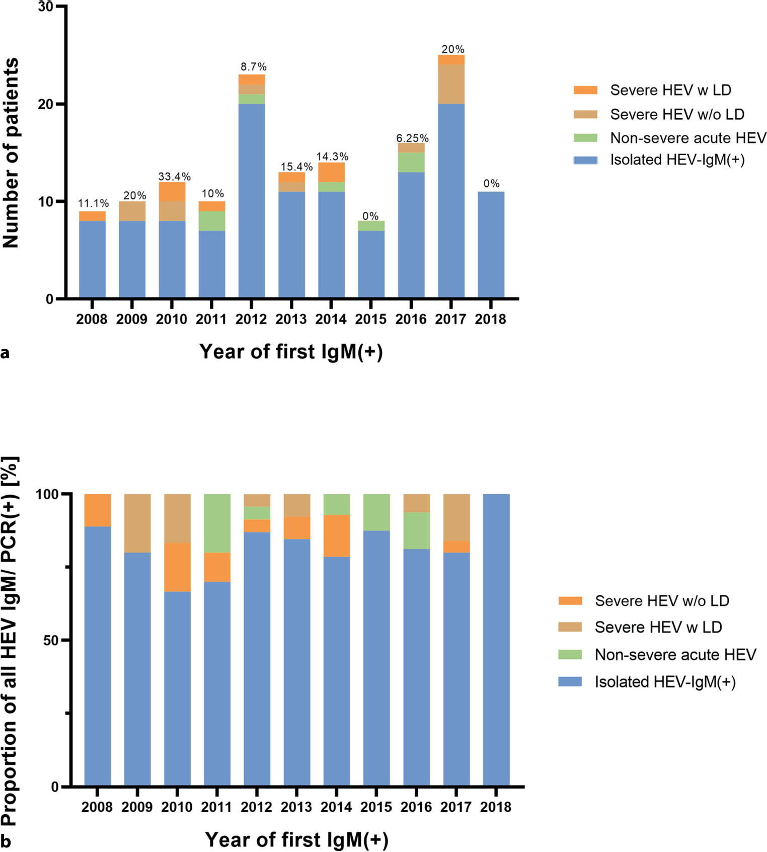 Among 151 HEV-IgM or PCR (+) (median age 51 years, 45.8% female), 7 (4.6%) had non-severe acute HEV infection (ALT ≥ 2–5-fold upper limit of normal, ULN), 11 (7.3%) had severe HEV infection without liver dysfunction (LD) (ALT > 5-fold ULN), and 9 (6.0%) with LD (ikterus or bilirubin > 5 mg/dL, OR coagulopathy or INR > 1.5, OR encephalopathy or ammonia > 100 µmol/L). HEV-RNA-PCR was performed in 58/190 (30.5%) HEV-IgM (+) patients and was positive in 19 (30.6%). Rates of HEV IgM/PCR positivity remained stable over the observation period.