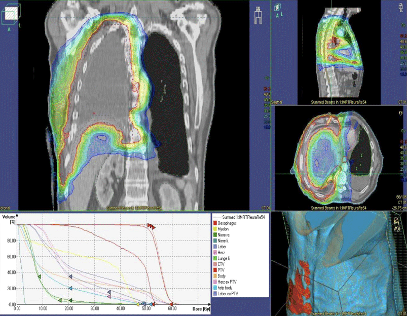 This concept (SMART) aims at inactivation of the tumor and improvement of its resectability [19, 20]. Patients are treated with a hypofractionated radiotherapy, which means the application of a higher dose of 5 Gy on 5 consecutive days with an integrated boost of 6 Gy to the macroscopic tumor. The target volume encompasses the whole lung including the visceral and parietal pleura. To reduce the high dose to the organs at risk as esophagus, liver, heart, or spinal cord, intensity-modulated radiotherapy technique (IMRT), VMAT (volumetric modulated arch therapy), or Tomotherapy is the treatment of choice. After radiotherapy an extrapleural pneumonectomy (EPP) has to be performed within 8–10 days after the end of radiotherapy.