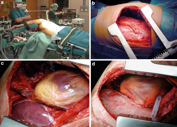 Surgical setting and intraoperative pictures of extrapleural pneumonectomy (EPP): a positioning of patient in OR; b situs after extrapleural mobilization of the lung; c lung, diaphragm, and pericardium have been removed; d situs after reconstruction of diaphragm and pericardium