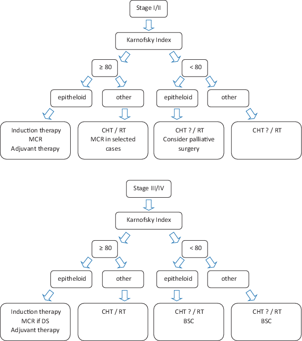 At the time present, no worldwide accepted surgical therapy exists and the choice of procedure depends on tumor stage, clinical presentation, and especially on institutional expertise and preferences. Pooling of MPM patients in specialized centers is mandatory to improve results of surgical treatment within multimodality protocols. A proposed, stage-dependent treatment algorithm is depicted in Fig. 3.