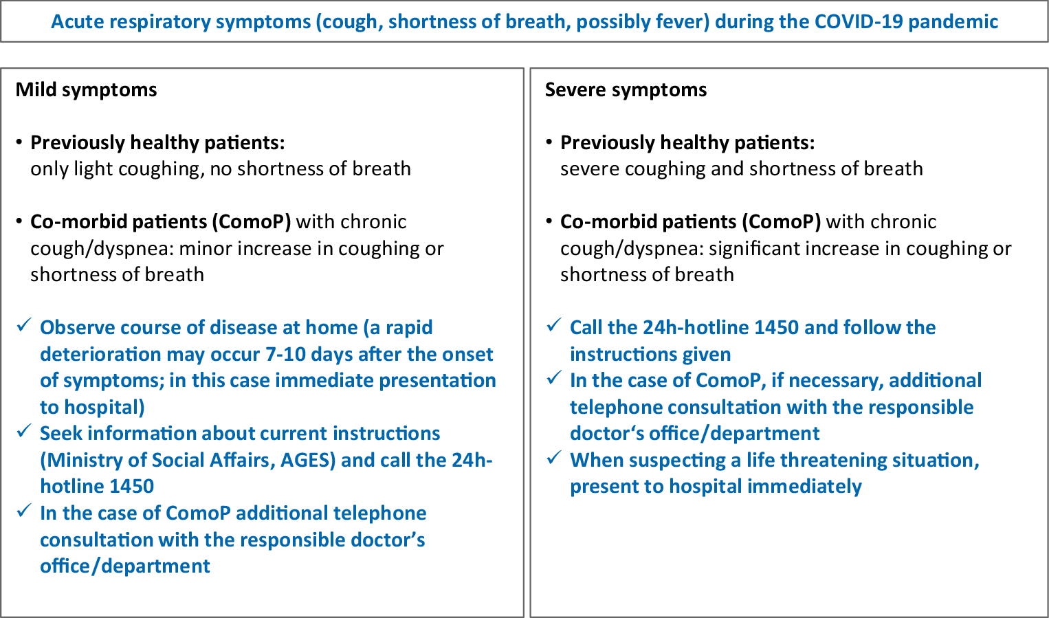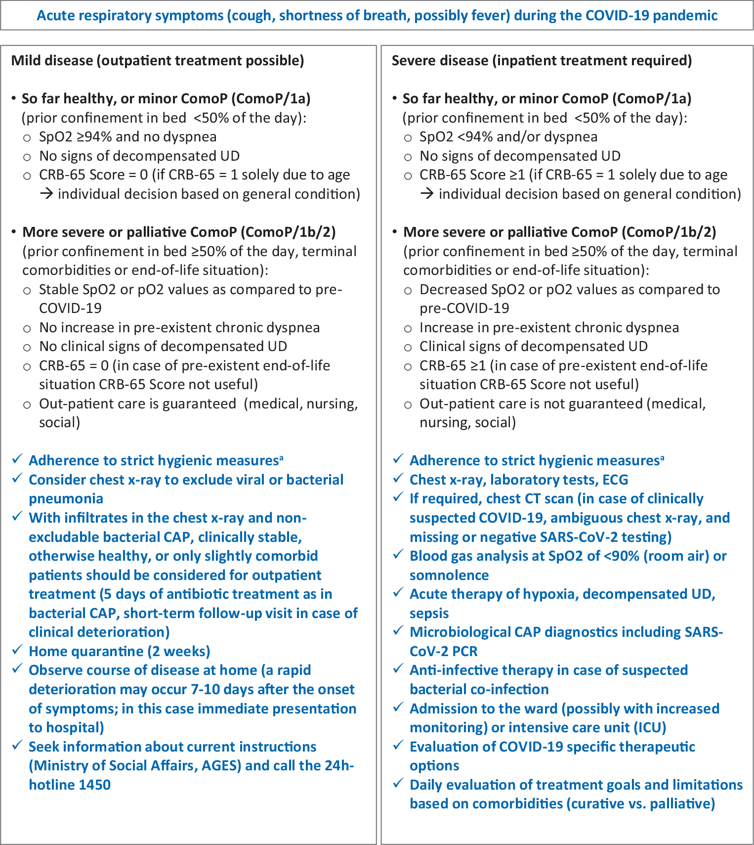 The key signs and symptoms of almost all respiratory tract infections are cough, possibly fever and dyspnea. This applies to any kind of bacterial or viral acute bronchitis, COPD exacerbation or pneumonia including COVID-19. Although COVID-19 is currently being diagnosed in hospitals to a larger extent, other acute cardiorespiratory diseases and infections are also present and will likewise increase again after the liberalization of the social pandemic measures. Therefore, CAP diagnostics that are exclusively focused on COVID-19 is unreasonable. In Austria CAP diagnostics should generally continue to follow the current recommendations from the German-Austrian-Swiss CAP guideline for adults from 2016 and for children and adolescents from 2017 [55, 56].