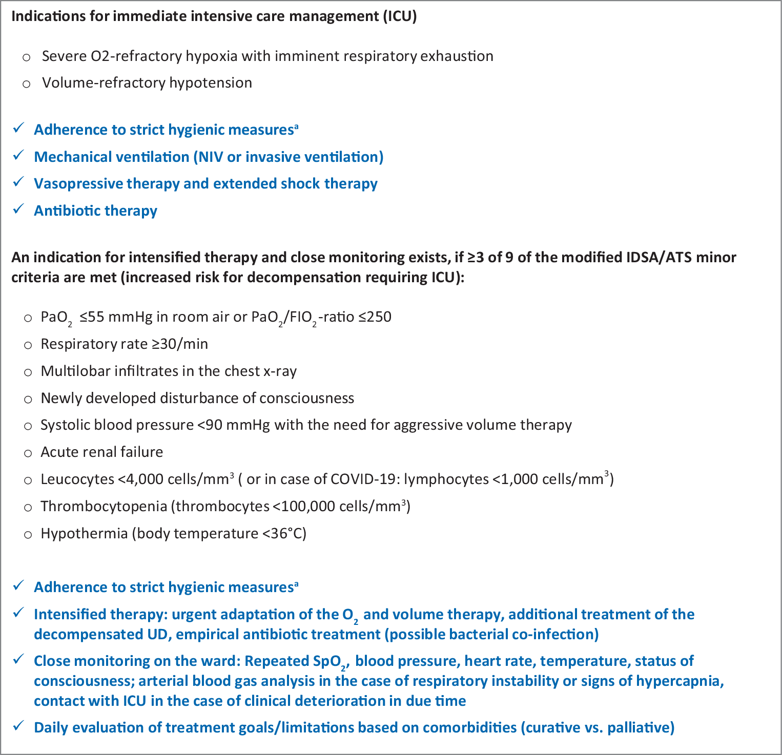Guidance for the identification of critically ill CAP patients during the COVID-19 pandemic (CAP as an emergency) (adapted from [55, pp. 151–200]). aRobert Koch Institute guidelines on hygienic measures within the framework of the treatment and care of patients with a SARS-CoV‑2 infection: https://www.rki.de/DE/Content/InfAZ/N/Neuartiges_Coronavirus/Hygiene.html. CAP community-acquired pneumonia, UD underlying disease, IDSA/ATS Infectious Diseases Society of America/American Thoracic Society, NIV non-invasive ventilation, ICU intensive care unit