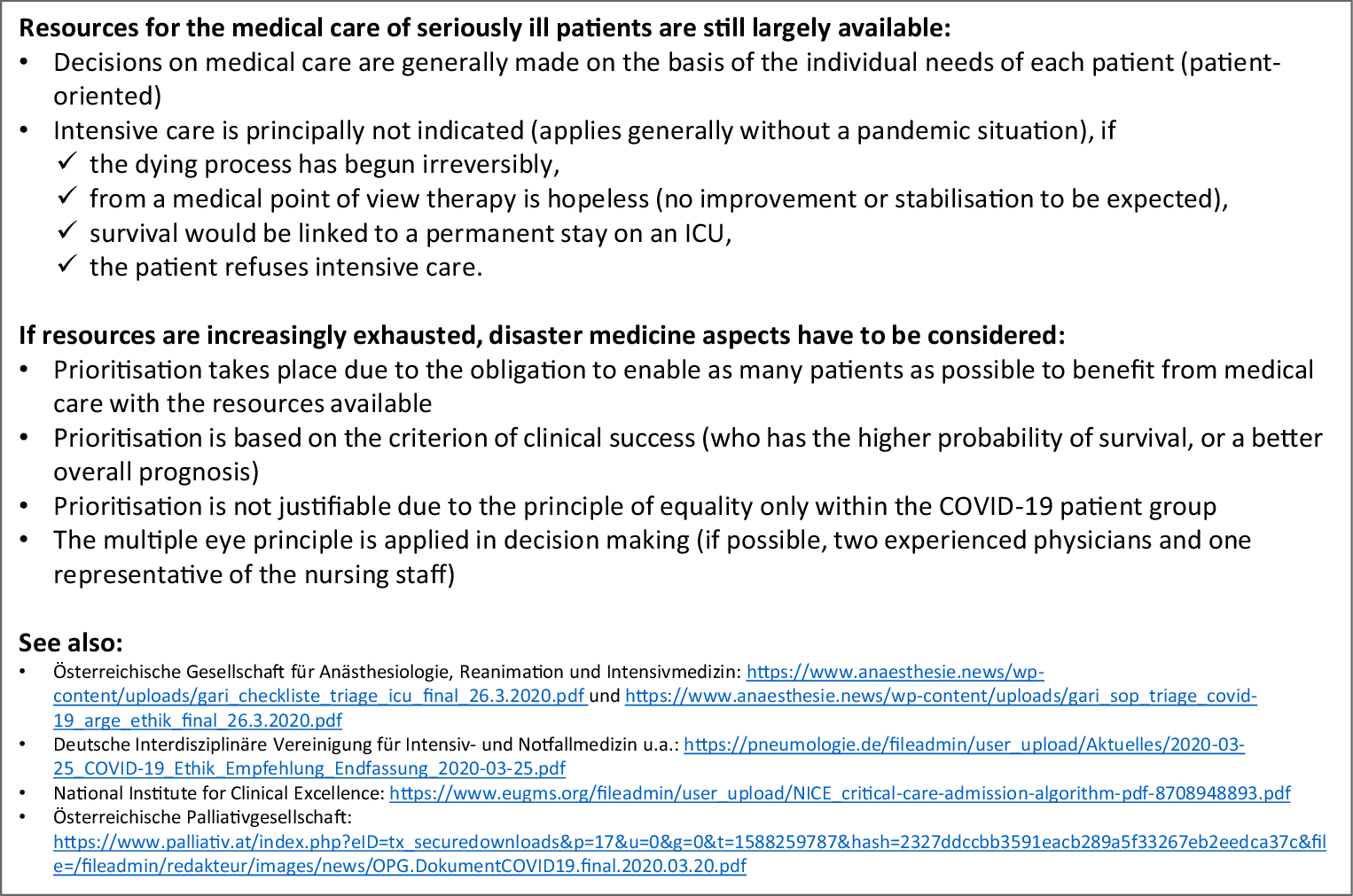 In order to attain all three of the aforementioned goals, as far as the current resources (which are limited due to the pandemic) allow, alignment of medical activities with existing evidence-based and well-implemented guidelines and their adaptation to the currently difficult situation, as might be required in individual cases, should be continued. Especially with respect to chronic diseases, acting with good judgement and open communication with patients and relatives are required to find feasible solutions.