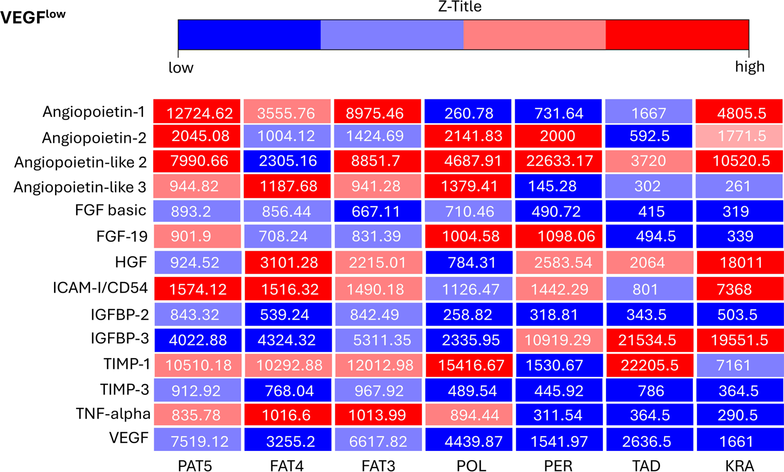 This heatmap shows the relative levels (in arbitrary pixel values) of 14 proteins involved in angiogenesis, as evaluated by two independent Human Adipokine Arrays (Catalog #ARY024, R&D Systems, Minneapolis, MN, USA). These arrays were performed on seven vascular endothelial growth factorlow adipose-derived stroma cell samples: PAT5, FAT4, FAT3, POL, PER, TAD, KRA. Standard deviation of all measurements was below 12%. FGF basic fibroblast growth factor 2, FGF-19 fibroblast growth factor 19, HGF hepatocyte growth factor, ICAM-I/CD54 intercellular adhesion molecule 1, IGFBP‑2 insulin like growth factor binding protein 2, IGFBP‑3 insulin like growth factor binding protein 3, TIMP‑1 tissue inhibitor of metalloproteinases 1, TIMP‑3 tissue inhibitor of metalloproteinases 3, TNF-alpha tumor necrosis factor, VEGF vascular endothelial growth factor