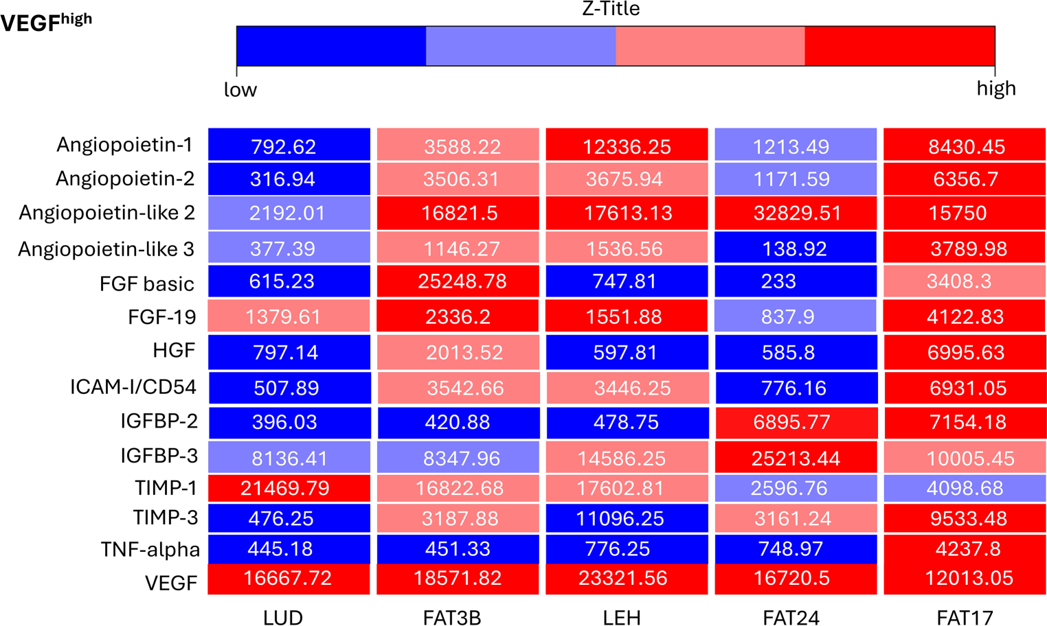 This heatmap shows the relative levels (in arbitrary pixel values) of 14 proteins involved in angiogenesis, as evaluated by two independent Human Adipokine Arrays (Catalog #ARY024, R&D Systems, Minneapolis, MN, USA). These arrays were performed on five vascular endothelial growth factorhigh adipose-derived stroma cell samples: LUD, FAT3B, LEH, FAT24, FAT17. Standard deviation of all measurements was below 12%. FGF basic fibroblast growth factor 2, FGF-19 fibroblast growth factor 19, HGF hepatocyte growth factor, ICAM-I/CD54 intercellular adhesion molecule 1, IGFBP‑2 insulin like growth factor binding protein 2, IGFBP‑3 insulin like growth factor binding protein 3, TIMP‑1 tissue inhibitor of metalloproteinases 1, TIMP‑3 tissue inhibitor of metalloproteinases 3, TNF-alpha tumor necrosis factor, VEGF vascular endothelial growth factor