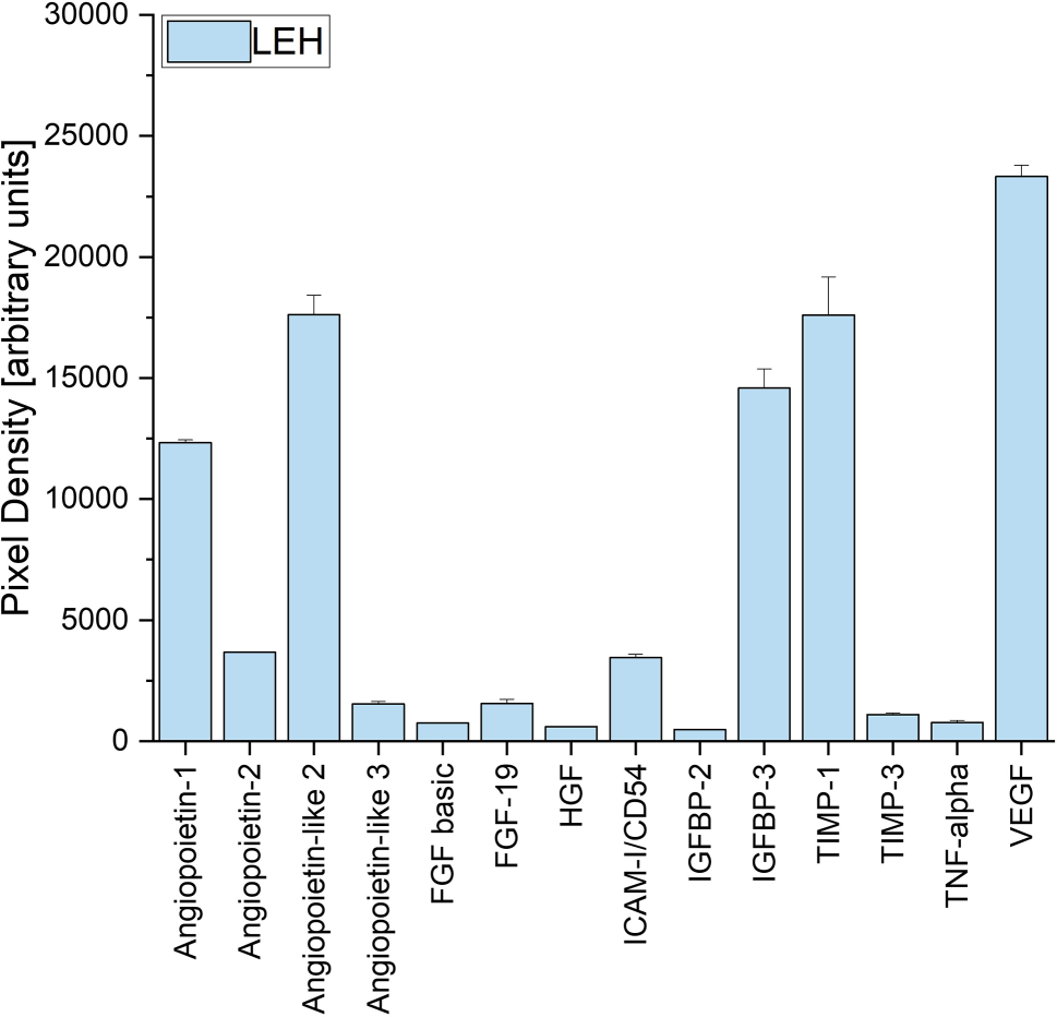 The most relevant angiogenic factors were assessed for ADSCs with high (VEGFhighn = 5) and low VEGF (VEGFlown = 7) expression (Figs. 1 and 2). These adipokines are angiopoietin‑1, angiopoietin‑2, angiopoietin-like 2, angiopoietin-like 3, FGF basic, FGF-19, HGF, ICAM-I/CD54, IGFBP-2, IGFBP-3, TIMP-1, TIMP-3 and TNF-alpha and VEGF. Heatmaps were chosen to depict differences in the levels of these 14 adipokines in ADSCs with either VEGFlow or VEGFhigh (Figs. 1 and 2). While there were several observable differences between VEGFlow and VEGFhigh ADSCs, only FGF-19 (p = 0.043) and IGFBP‑3 (p = 0.028) showed statistically significant differences. The Human Adipokine Array shown provides an example of a single array as demonstrated by the VEGFhigh conditioned supernatant of ADSCs of patient LEH (Fig. 3).