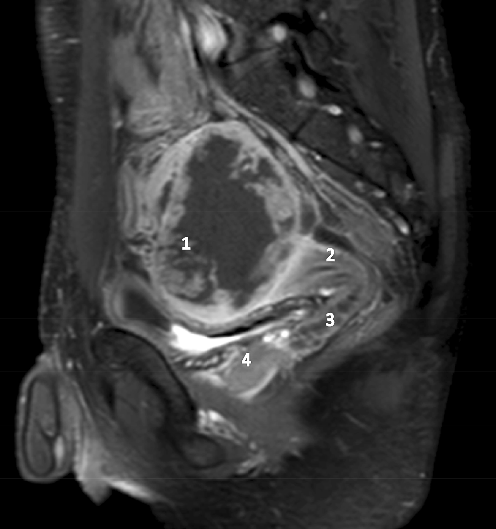 Magnetresonanztomographie: (1) Linkseitiger Keimzelltumor, (2) Gebärmutter mit Gebärmutterhals und kurzes (3) Vaginalrohr, welches an der (4) Prostata mündet
