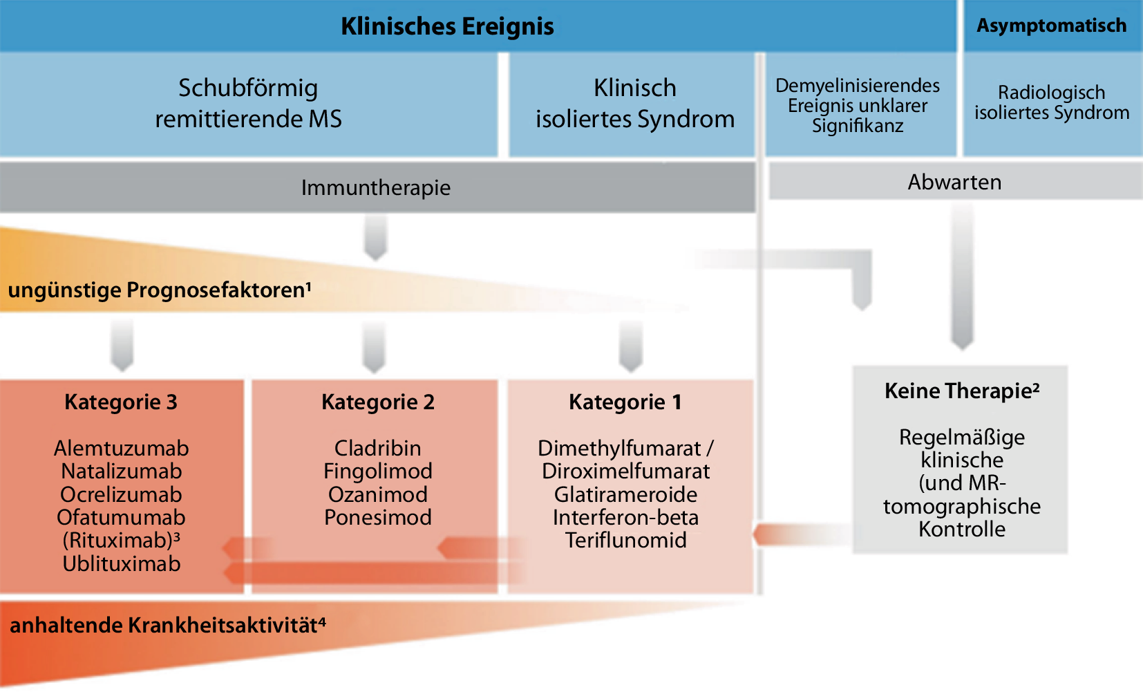 Die häufigste Erkrankungsform stellt die schubförmige MS (RRMS) dar, progrediente Verlaufsformen (SPMS, PPMS) betreffen eine kleinere Patientengruppe. Das Ziel der eingesetzten MS-Therapien sollte ein Freisein von Schüben, Verhinderung von Behinderungsprogression sowie fehlende MRT-Aktivität sein. Neuere Studiendaten zeigen einen Trend zum frühen Einsatz von MS-Medikamenten und auch schon zum frühzeitigen Einsatz potenter Therapieoptionen („Hit-hard-and-early-Konzept“) im Gegensatz zum früher gängigen Eskalationsansatz („Treat-to-target“).