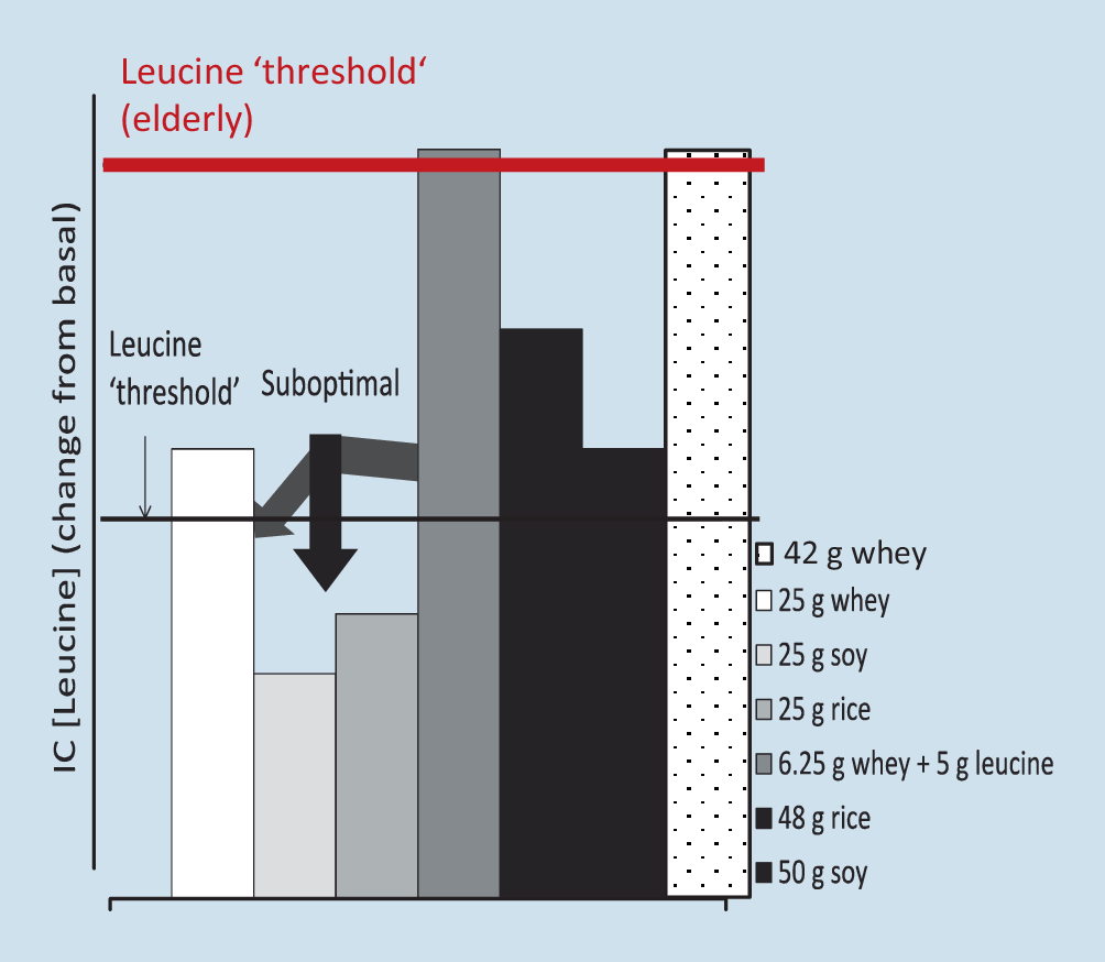 Zur Steigerung der myofibrillären Proteinsyntheserate benötigen ältere Menschen mindestens 40 g schnellverdauliches, L‑Leucin-reiches Protein (Molkenprotein, [5]). Auch bei älteren Menschen existiert eine Obergrenze (Steigerung der Proteinoxidation). Diese liegt allerdings bei mindestens 40 g pro Portion. Alternativ und anstelle von 40 g Molkenprotein können auch kleinere Mengen an Molkenprotein verwendet werden, allerdings müssen diese mit L‑Leucin angereichert (sog. Molkeäquivalente) werden. Generell wird die Leucinschwelle durch den Alterungsprozess und körperliche Aktivität erhöht. Um die leucinspezifische Schwelle für Muskelneusynthese im Alter zu erreichen, braucht es entweder 42 g Molkenprotein oder 6,25 g Molkenprotein mit 5 g Leucin ([7]; Abb. 2).