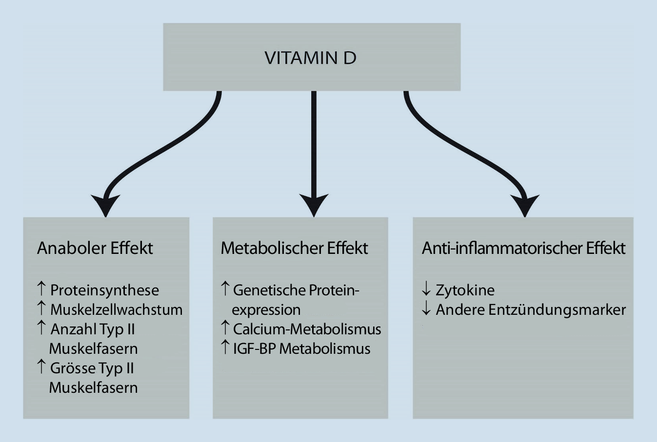 Omega-3-Fettsäuren (3,9 g n-3-PUFA pro Tag) haben eine stimulierende Wirkung auf den Muskelproteinmetabolismus und die mitochondriale Bioenergetik im Alter und erhöhen die anabole Muskelantwort auf Training ([9]; Abb. 3). Auch bei Kreatin gibt es Evidenz für positive Wirkungen auf die Muskelgesundheit im Alter, insbesondere zur schnelleren Heilung von Muskelverletzungen, aber auch für eine bessere Muskelrobustheit bei starker Beanspruchung. Hier verwendete Dosierung gehen bis zu 30 g/Tag über 5 Jahre, was auch im Alter bzgl. Sicherheit kein Problem darstellt [10]. Die Wirkungen von Vitamin D3 auf den Muskelstoffwechsel sind multipel und reichen von anabolen, metabolen bis zu antiinflammatorischen Effekten (Abb. 4; [11]). Die internationale Dosissubstitutionsempfehlung von Vitamin D3 im Alter liegt bei 800 IE/Tag. Dies wird grundsätzlich durch eine neuere Studie bei älteren Menschen mit Sturz im Vorjahr (Durchschnittsalter 78 Jahre) bestätigt, welche die Wirksamkeit und Sicherheit der monatlichen Referenzdosierung von 24.000 IE Vitamin D bezüglich Korrektur des Vitamin-D-Mangels, Verbesserung der Beinfunktion und Senkung des Sturzrisikos zeigte [12] Höhere monatliche Vitamin-D-Gaben verglichen zur Referenzdosis von 24.000 IE/Monat brachten keinen Vorteil bezüglich Beinfunktion und trugen zu einem erhöhten Sturzrisiko bei.
