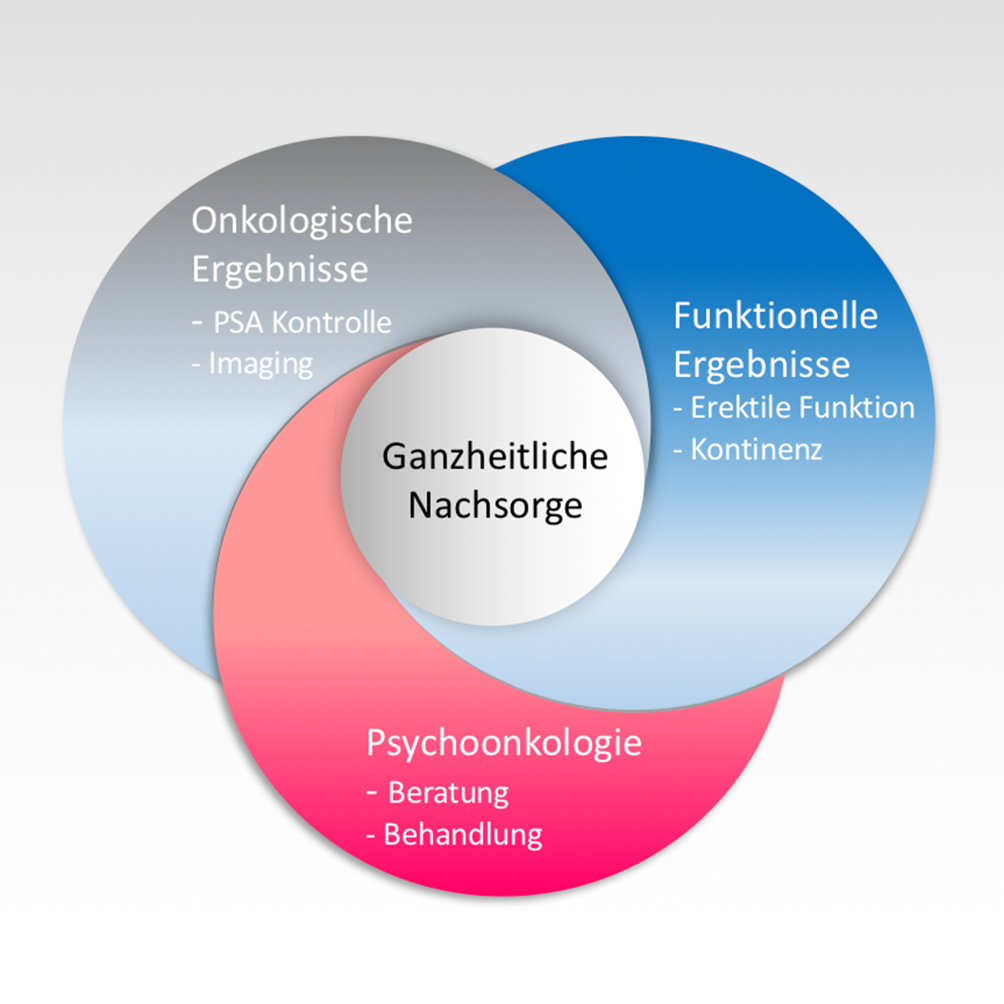 Eine kurative Therapie kann entweder durch die operative Entfernung der Prostata oder durch eine Strahlentherapie erreicht werden. Nach Abschluss der kurativen Behandlung beginnt die wichtige Phase der Nachsorge. Im Vordergrund steht hier das onkologische Ergebnis. Regelmässige PSA-Wert-Kontrollen helfen dabei, ein Rezidiv oder eine Metastasierung des Tumors frühzeitig zu erkennen und behandeln zu können. Von grosser Bedeutung sind auch die funktionellen postoperativen Ergebnisse wie Kontinenz und erektile Funktion sowie die Behandlung von physischen und psychischen Begleit- und Folgeerkrankungen, die nach einer Operation oder Bestrahlung auftreten können.